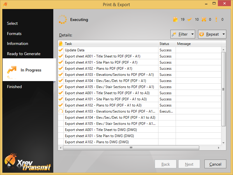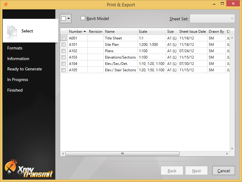 Xrev Transmit for Autodesk® Revit®, simplifies the process of exporting, printing and tracking drawing sheets and the model for Revit.
