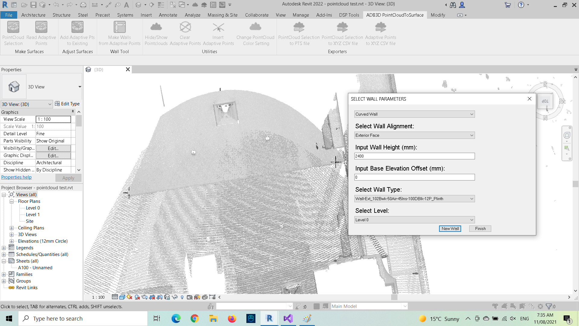 Wall Tool: Mark out your wall lines with adaptive points that snap to the point cloud then use the wall tool to create straight or curved walls that align with your marks.
