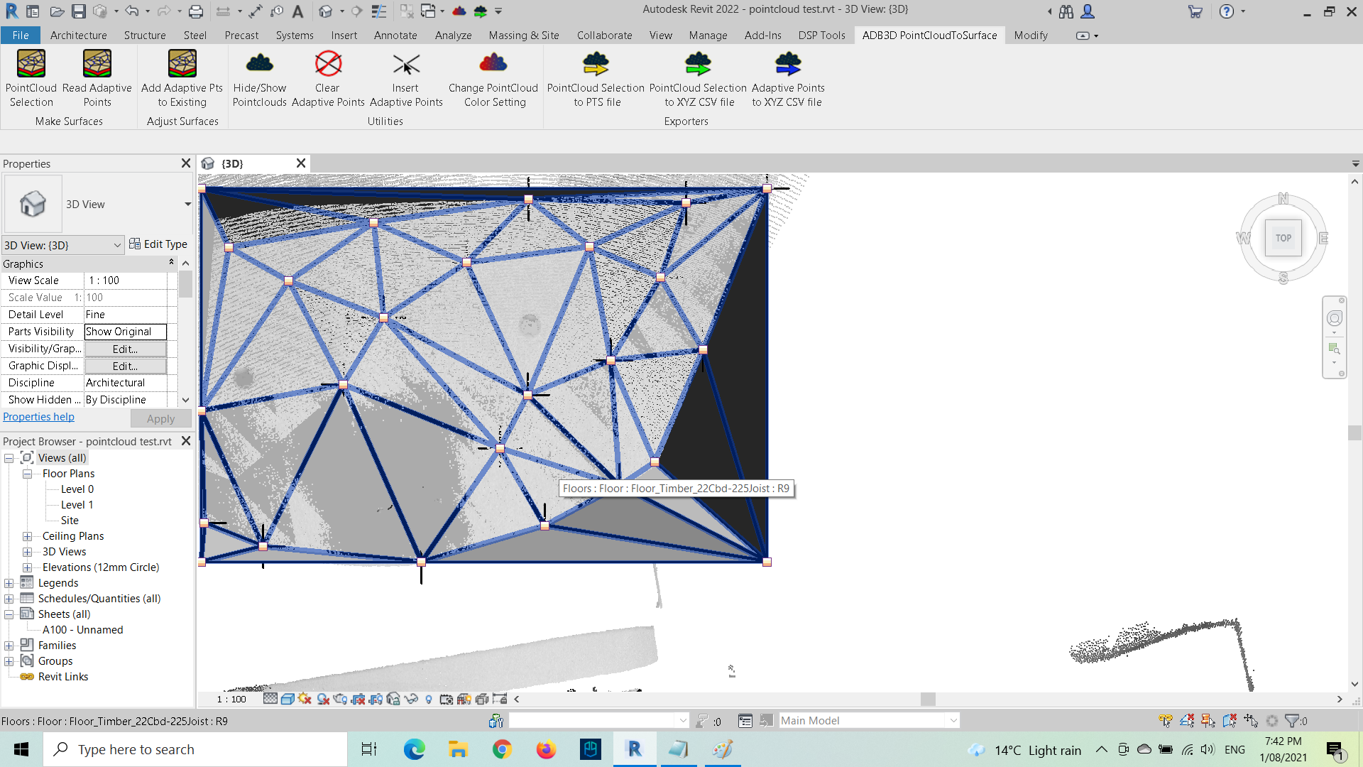 Surface from adaptive points: Reads all adaptive points from your document and creates a new topography, floor or roof element mapped to those points. This takes advantage of the adaptive point ability to snap to pointclouds since Revit 2011.