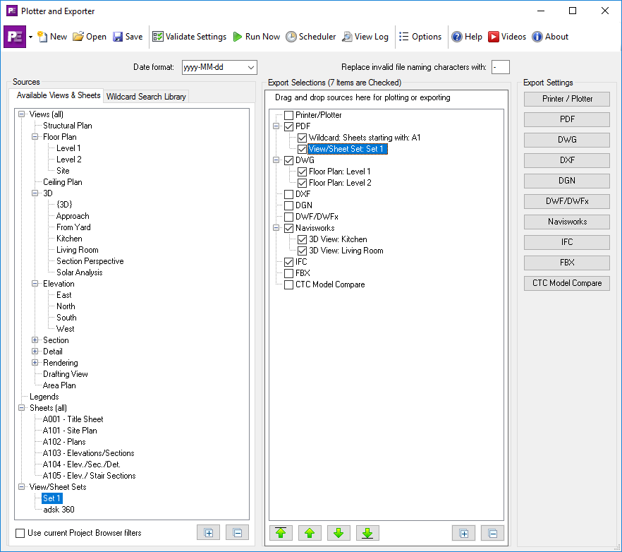 This tool provides an intuitive and easy-to-learn interface that allows users to create and schedule jobs for export or plotting, schedule exports to occur automatically, specify individual sheets and/or views to export, or dynamically search for views or sheets. Exports to PDF, DWG, DXF, DGN, DWF, DWFx, FBX, Navisworks, and IFC files.