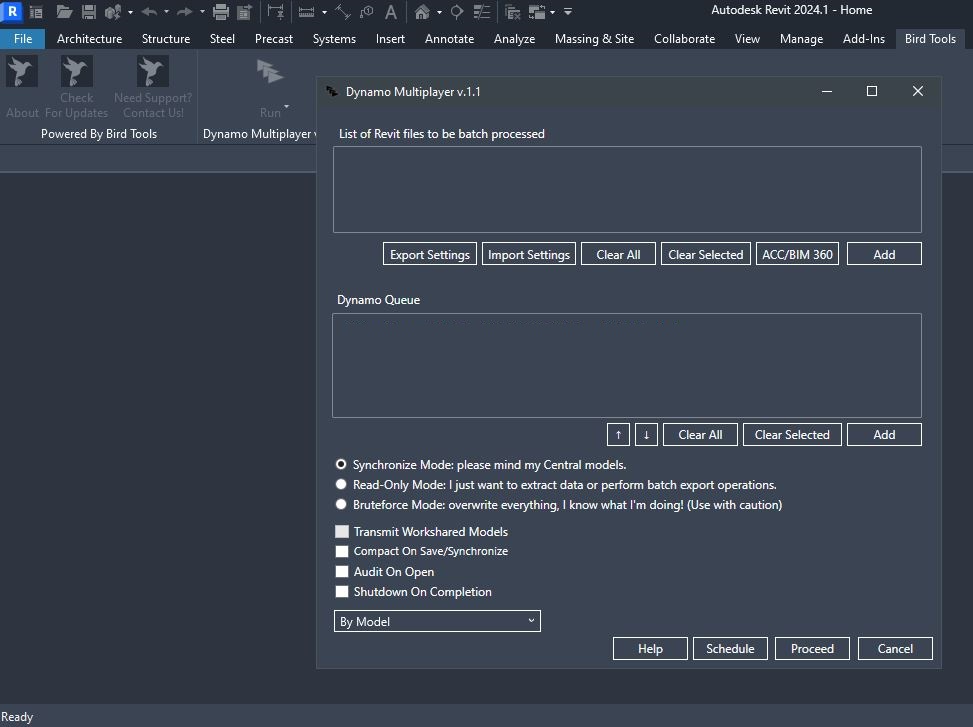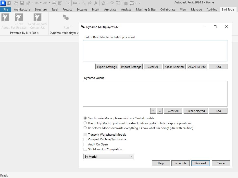 Dynamo Multiplayer is a Free Autodesk® Revit® Add-In by Bird Tools. It is the ultimate universal Autodesk Revit batch processing tool, allowing the user to batch process several Revit models or families using one or multiple Dynamo scripts.