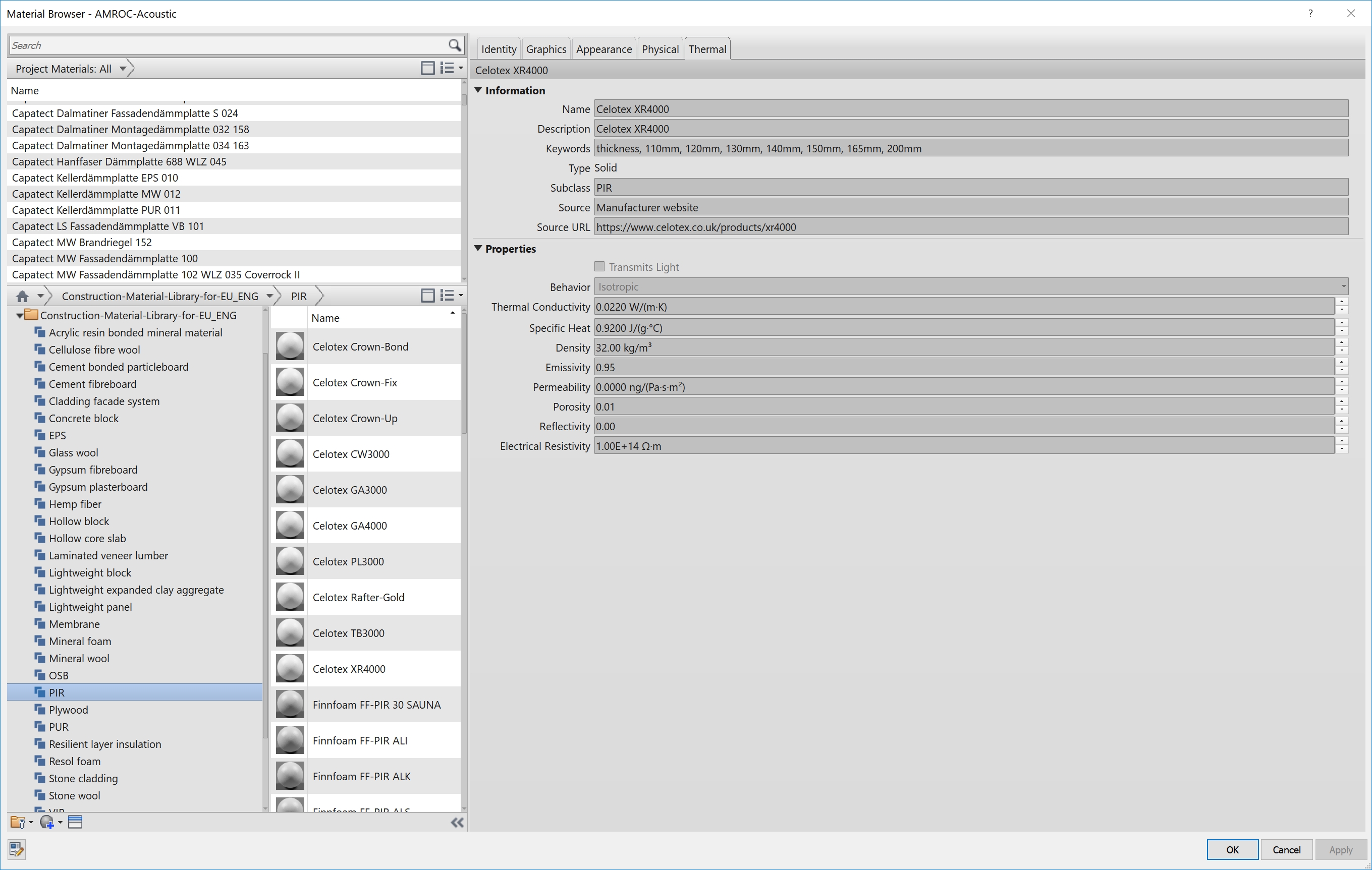 This construction Material Library can be used in most EU countries. The library includes manufacturer specific data about the materials like the material's density, thermal conductivity, and thickness. As such it is easier to include a specific material with real parameters onto a wall component and get an appropriate heat transfer coefficient (U value) directly. Change a material or thickness and this value changes accordingly. Additional information that is added into the material library is the material's thickness selection that helps to filter out the most appropriate combination. All material information is based on manufacturer datasheets, including a link (URL) from where additional information can be found. The library is available in English and Estonian. Although the library reach is the same in both cases, the descriptions are different (English or Estonian).