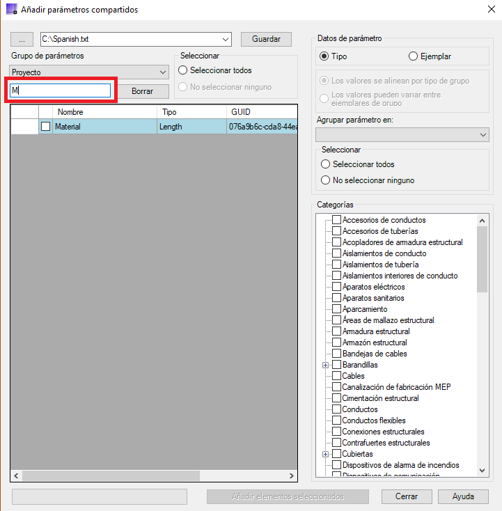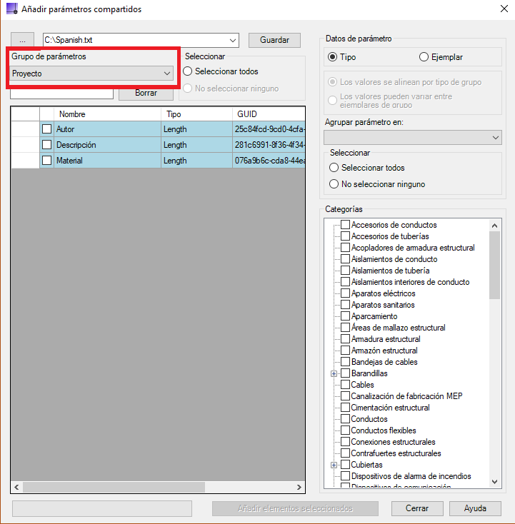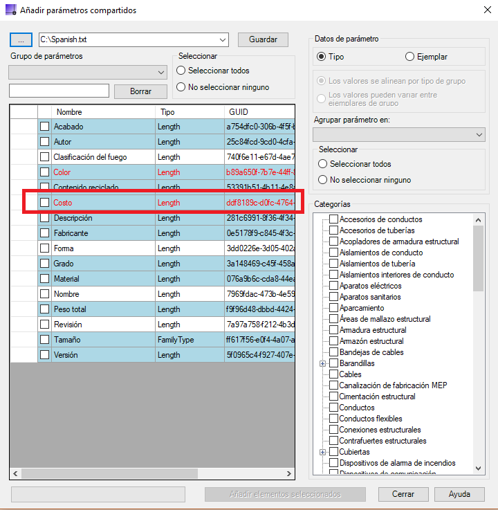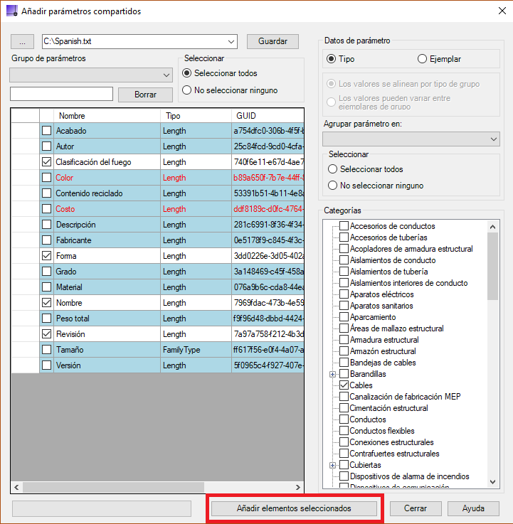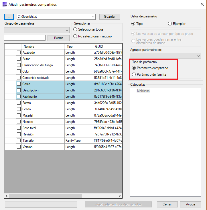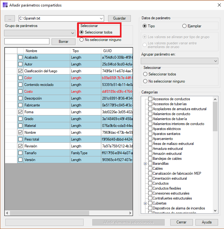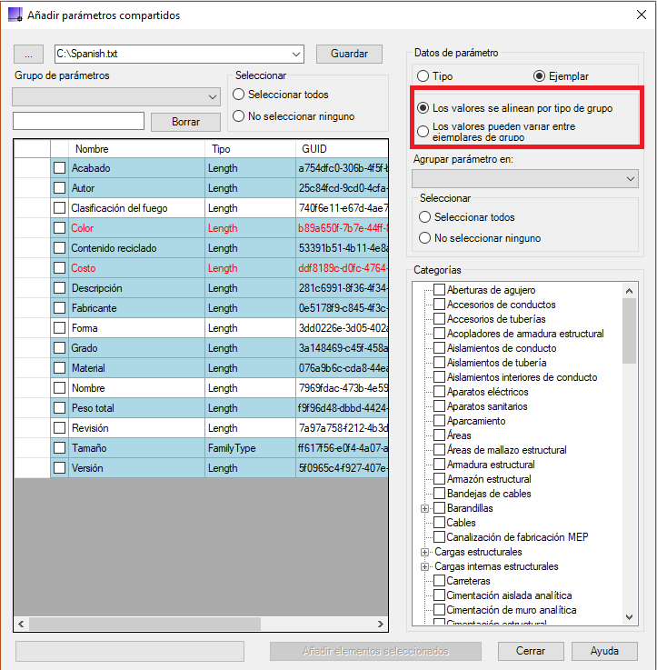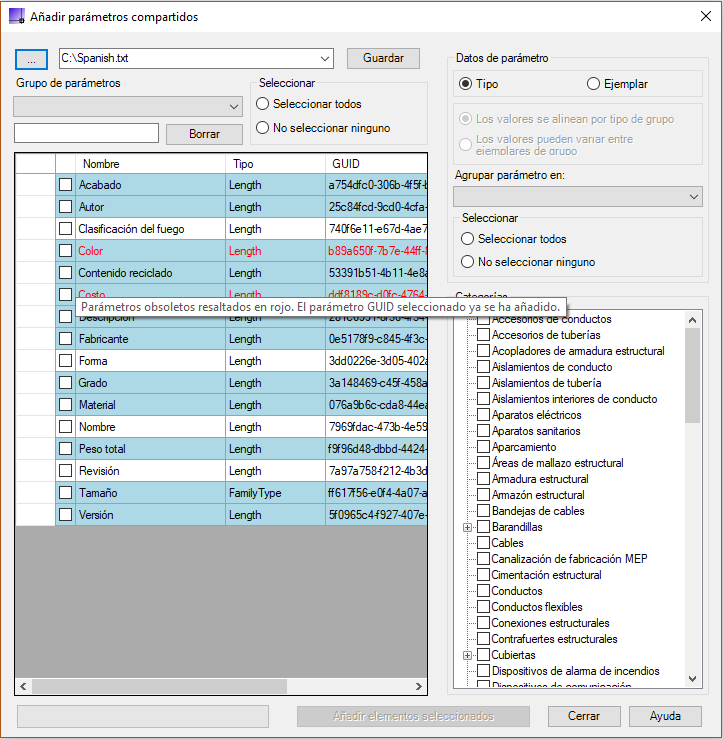 También destaca los parámetros ya existentes dentro del documento activo y parámetros obsoletos, que no están limitados a una categoría.