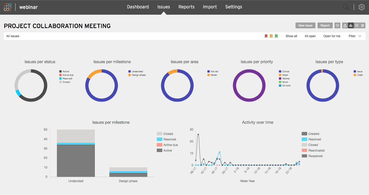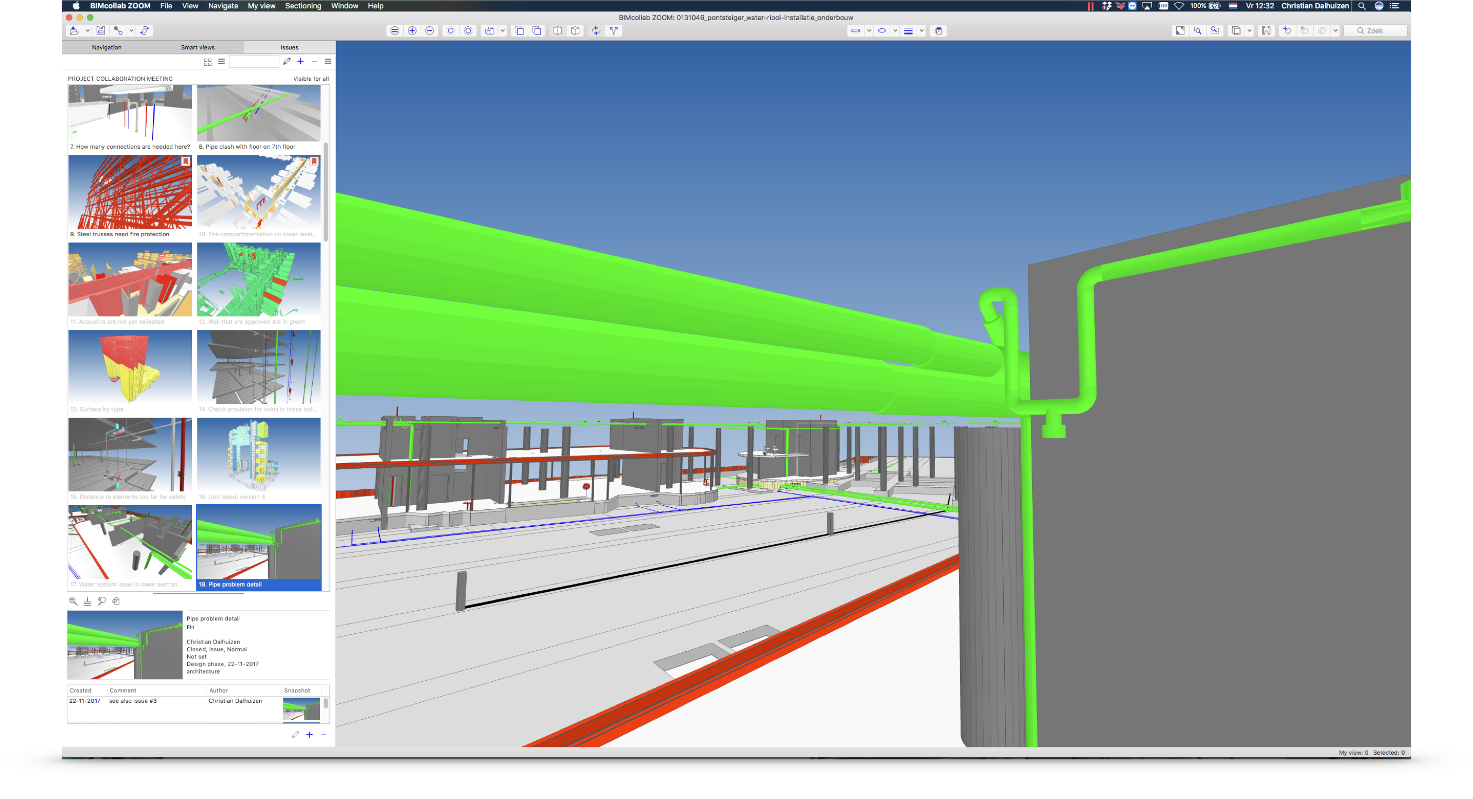 Tous les problèmes peuvent contenir des points de vue qui incluent la position de la caméra et les objets correspondants. Vous pouvez ainsi zoomer sur l'emplacement du problème en mettant en évidence les composants problématiques. En outre, des métadonnées telles que des descriptions des problèmes et des commentaires (par exemple, statut du clash, point de vue du clash, personne assignée à la résolution du problème, données d’approbation et plus encore), sont ajoutées aux problèmes. De plus, BIMcollab Nexus vous permet d'ajouter des informations sur les zones, les phases et les dates d’échéance, ainsi que de mettre en place un processus d'approbation.