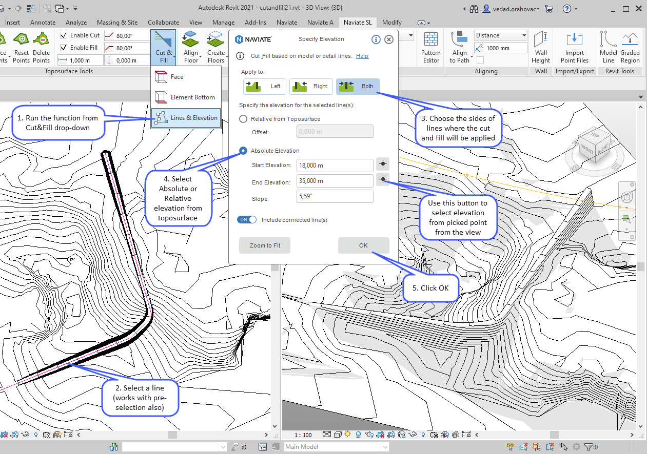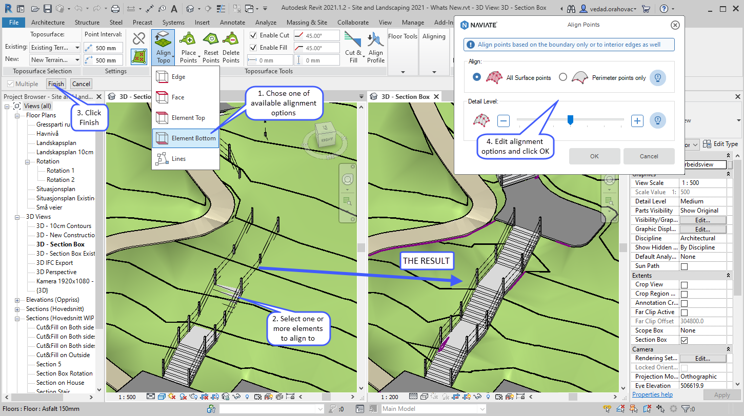 Align your topography to other hardscape feature such as Edges, Faces, Top and Bottom of element and Model Lines. Points are created according to the desired linear or radial incremental distance. Topo Surfaces work with existing and future phasing. The graded region tool is used to create a copy of the existing site conditions. This workflow enables Cut and Fill calculations in Autodesk® Revit®.