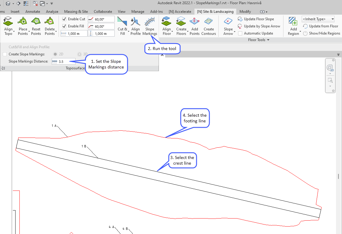 This is a tool used for graphical presentation of slope foot markings in a Plan view or a 3D view. With this tool you can automatically create slope markings by selecting top and bottom lines of the slope. It is also possible to create slope markings automatically when doing Cut&Fill or Align Profile commands.