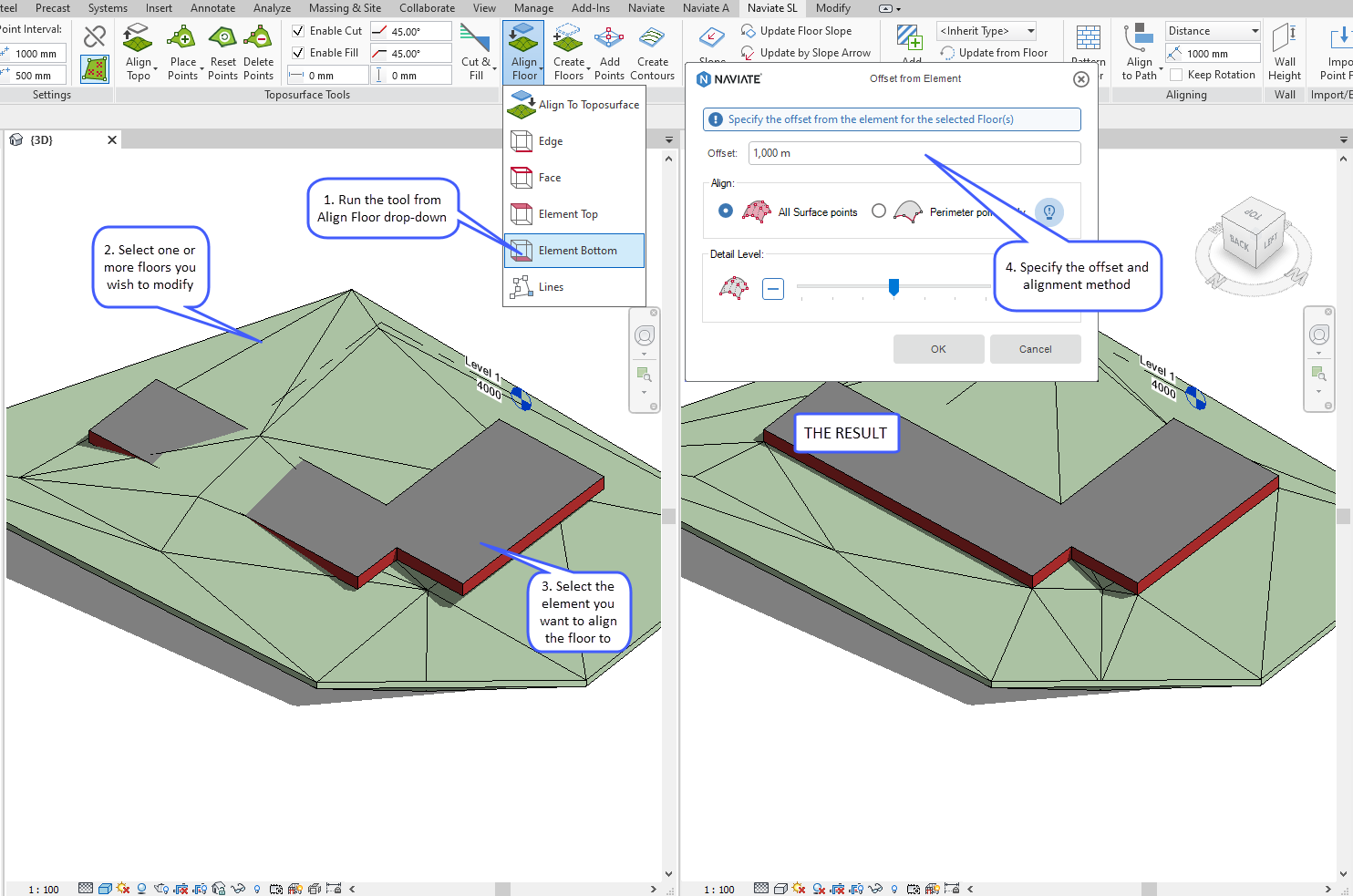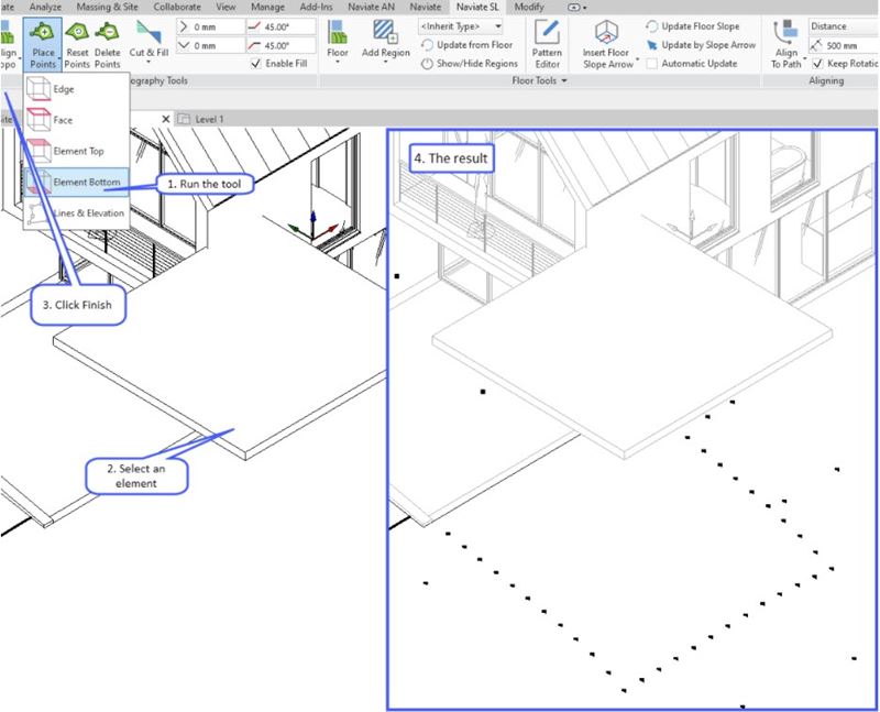 A tool that enables you to create a Floor from existing topography. The function reads all topopoints and adds them as sub-element points to the new Floor, mimicking the shape of the Topography, with the possibility to set an offset for alignment.