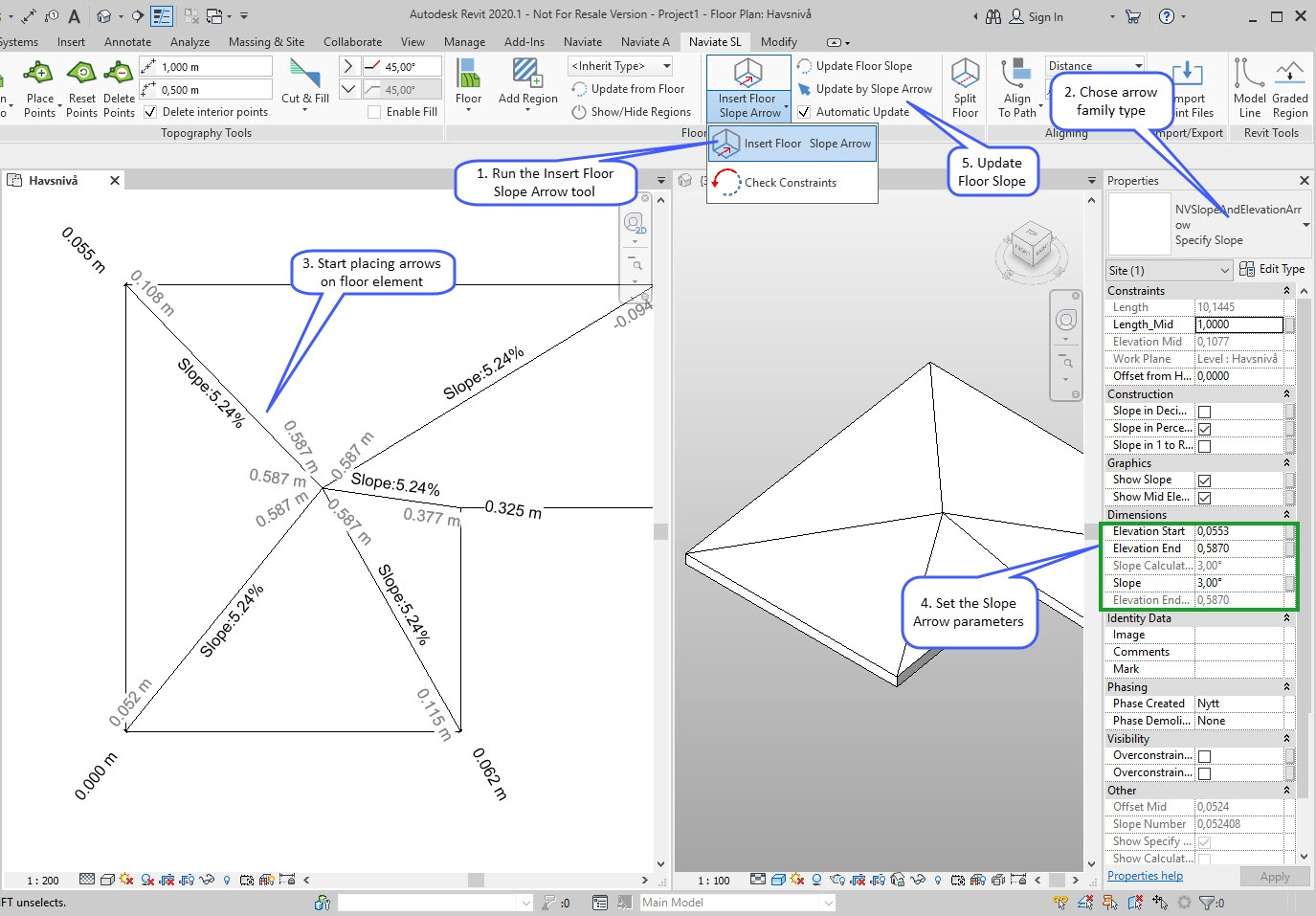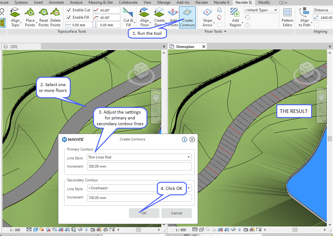 This is a tool used for adding contour lines to the top surface of Floors. Revit has the built-in functionality for displaying the contour lines on topographies, but not for floors. With Create Contours tool, you can easily mimic these lines. The tool will place Model lines using specified increment and line type.