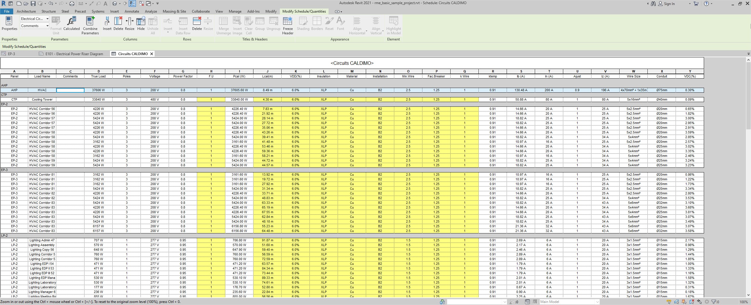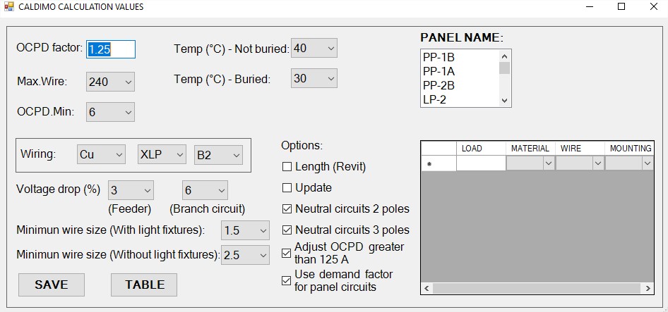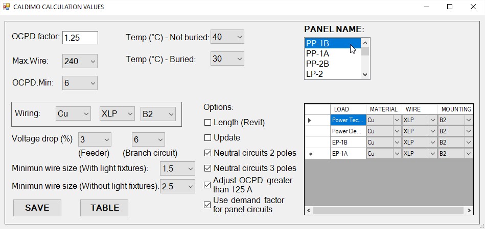 CALDIMO must have created electrical circuits and works with the values of electrical of Revit such as True Load, Length, Voltage, Number of Poles, Power Factor, and Number of Poles, among others.