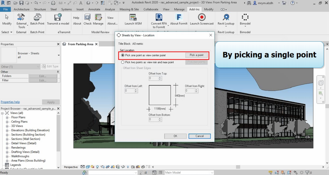 - Or pick two points to create a region. And automatically, the center of this region will be set as the center of the viewport. Also, by this option, you could simply define the margins of the title block to create the available region inside it.