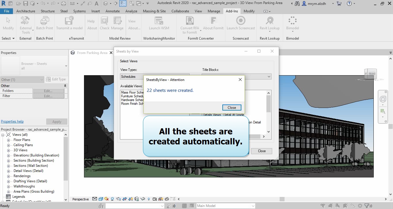 This add-in will help you to select your desired views in an Autodesk® Revit® file to create a sheet for each of them simultaneously.