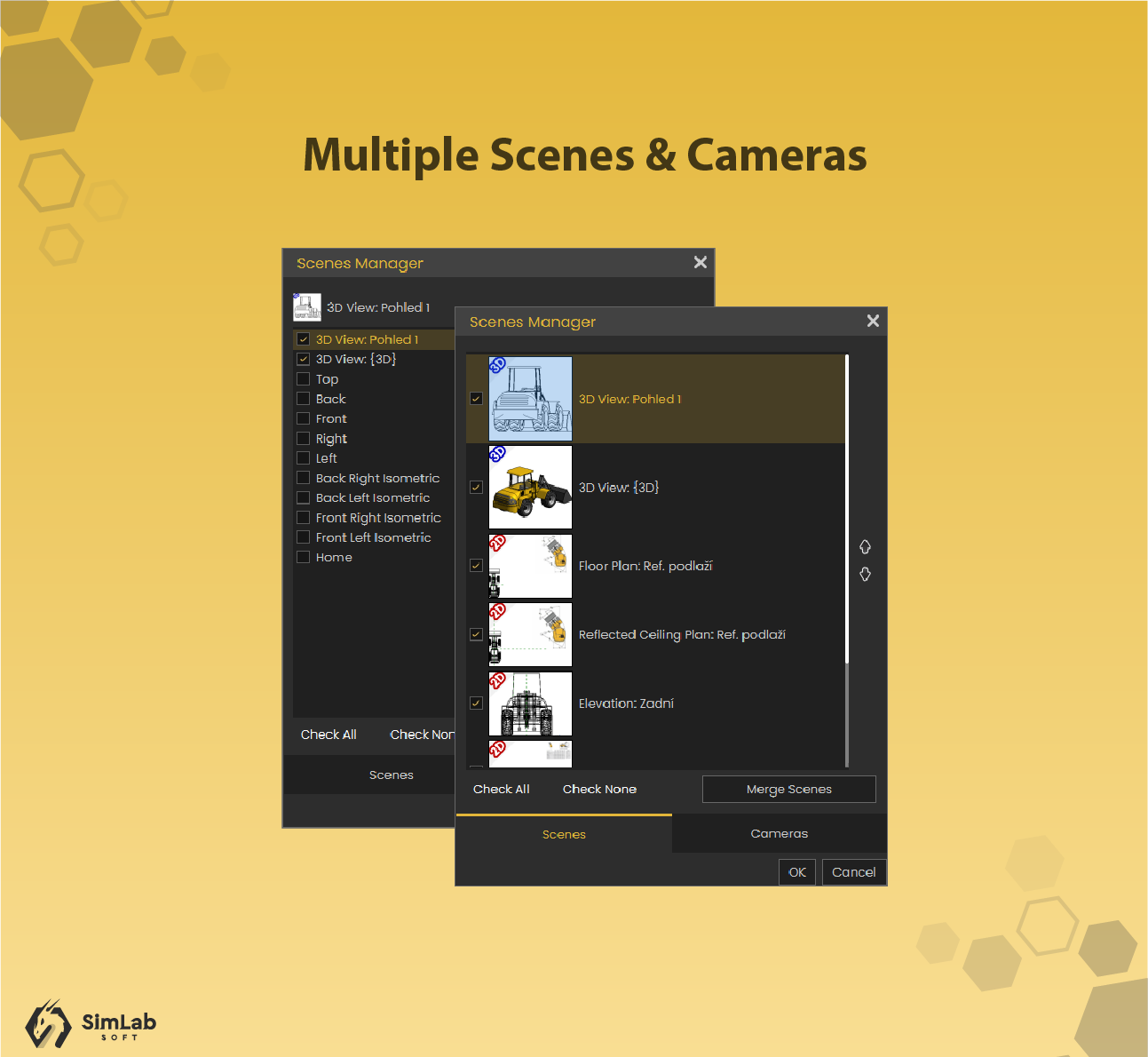 - Select between multiple scenes (3D and 2D) and cameras to be exported and embedded within the pdf file.