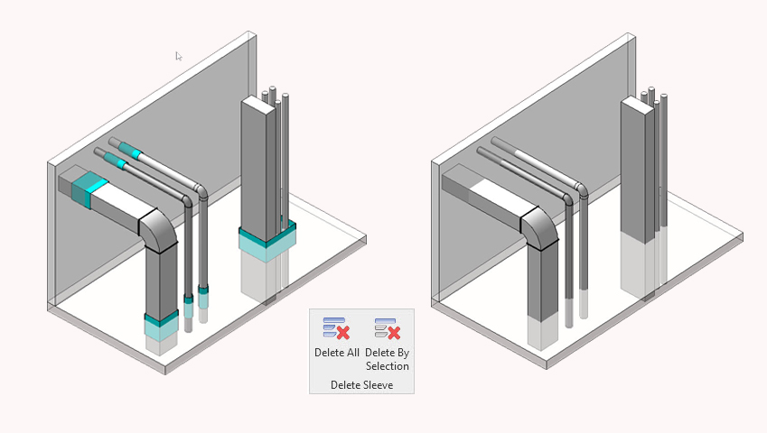 - Create sleeves that penetrate walls, beams, and floors for single MEP objects such as pipes, ducts, cable trays, conduits (Single Sleeve).