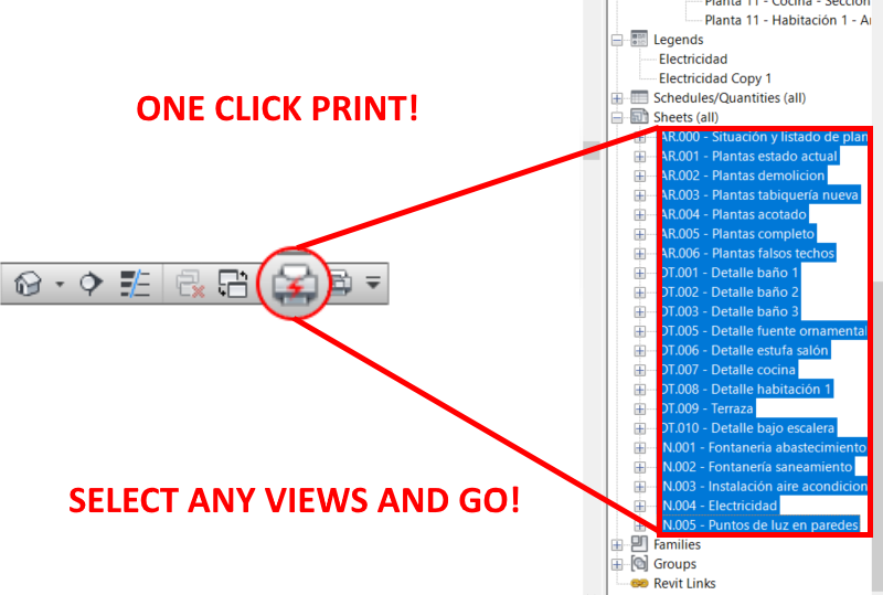 The easiest, fastest and most convenient way to print in Autodesk® Revit®. This easy to use app allows the user to print any amount of views, sheets or even schedules in just one click. The user may predefine the default settings such as the ìnstalled printer to be used and the Revit print set up from the previously saved list in the printer dialog.