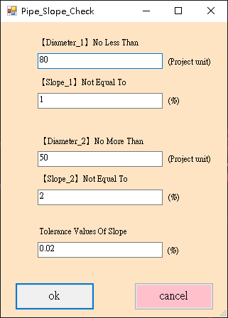 - If the pipe diameter is smaller than 【Diameter_2】, Check if the pipe slope equals 【Slope_2】