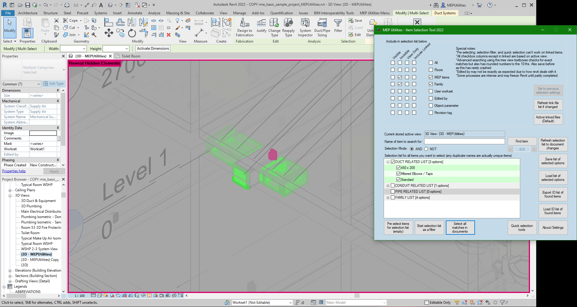 Autodesk® Revit® add-in tool that gives advanced and fast select methods for project elements allowing for better manipulation and collecting. By improving the process of finding and selecting elements time can be saved scrolling around projects, subsets of items can be better managed, and the use of exporting and loading element lists can allow faster references of previous work areas.