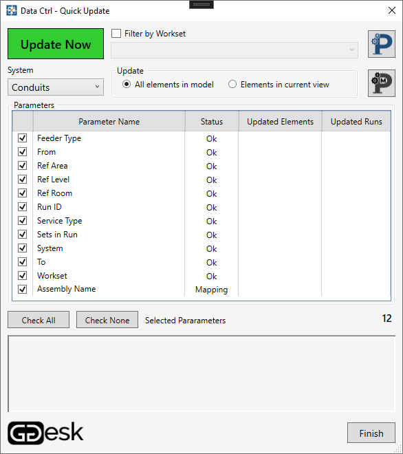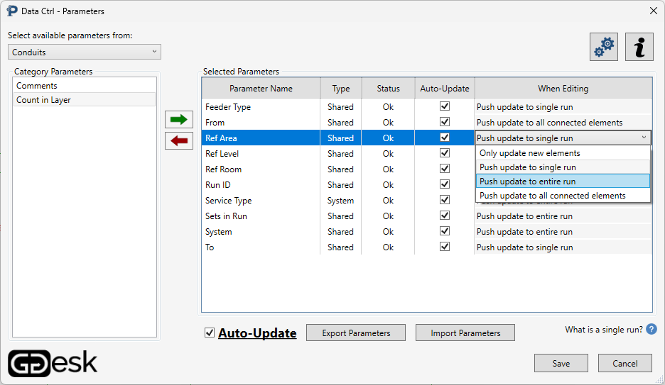 Data Ctrl automatically pushes parametric information through the entire MEP network, maintaining up-to-date parameter values as you modify the network's elements. For electrical networks such as conduits and cable trays, Data Ctrl pushes the parameter values to the Run Schedule. If any changes are made to the Run Schedule, they are transferred accordingly to the conduit or cable tray network.