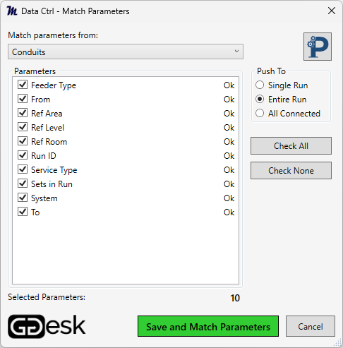 When editing individual elements in a run, Data Ctrl pushes updated parameter values to a single run, entire run, or all connected elements to maintain consistent information in the schedules.