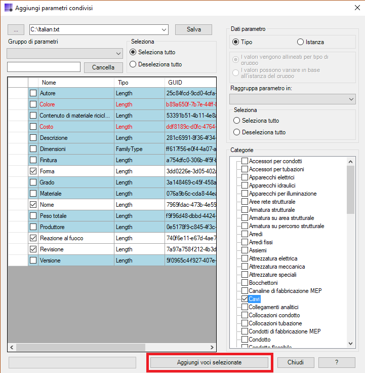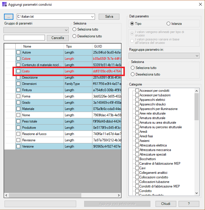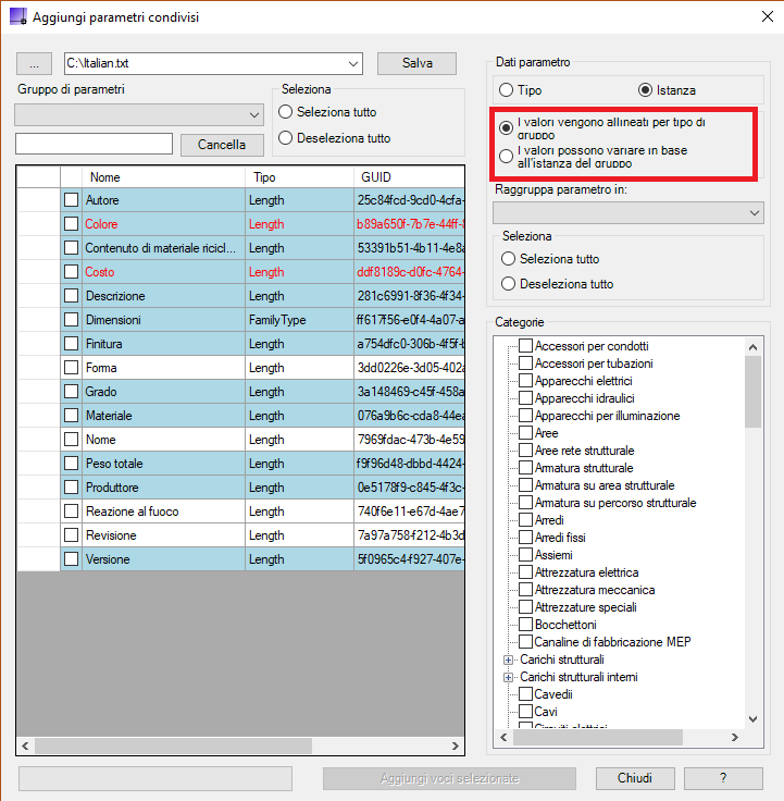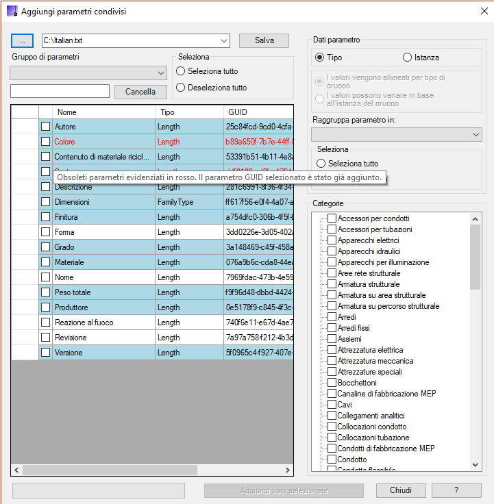 Si evidenzia anche i parametri già esistenti all'interno del documento attivo e parametri obsoleti, che non sono associati a una categorie.