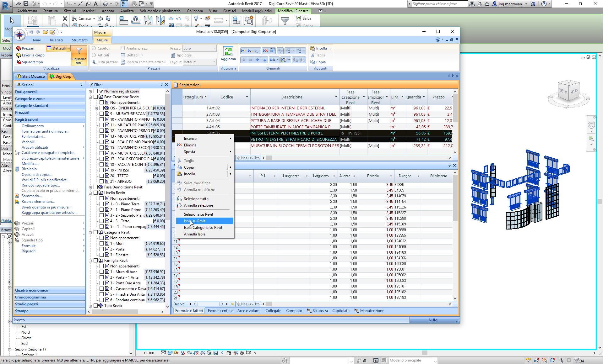 Seleziona in Mosaico (Può essere utilizzato per selezionare i righi di misura relativi alle istanze selezionate nel modello Revit nella finestra MOSAICO (Computo> Registrazioni)). Filtro in MOSAICO (Può essere utilizzato per filtrare i relativi righi di misura nelle istanze della finestra MOSAICO (Computo> Registrazioni) selezionato nel modello Revit). |