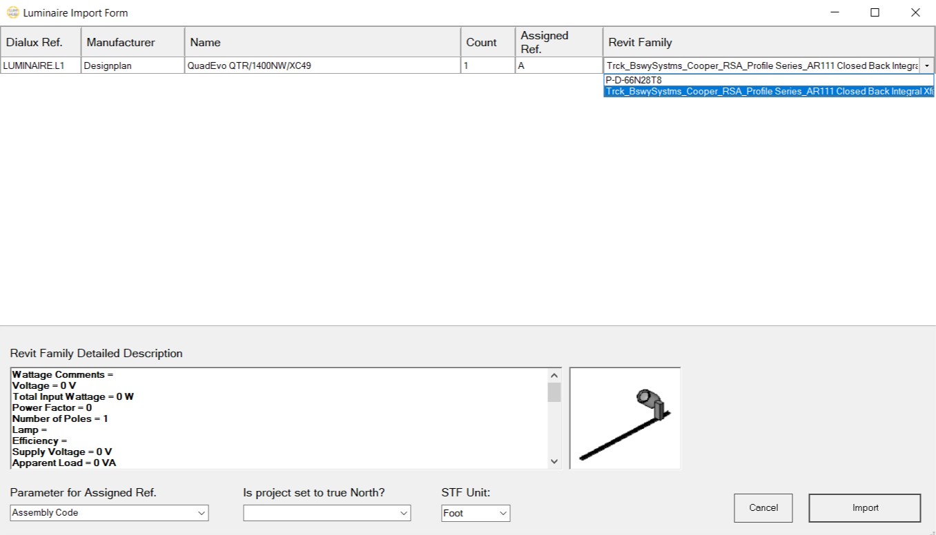 The import function works by reading in the STF file, the user can then assign Revit families to them and add references to a selected family parameter. The luminaires families are then placed in the model to match the DIALux calculation.