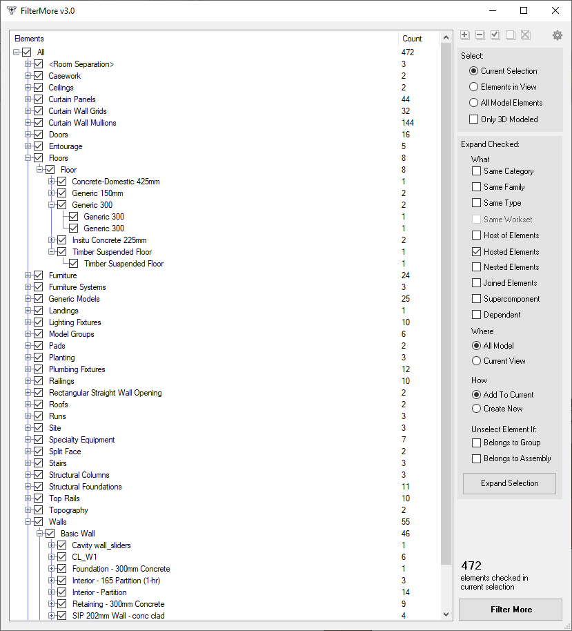 FilterMore is an advanced filter that will let you view your current selection as single elements and grouped by category, family, and type. It will also let you expand your current selection through different options like nested, joined, hosted or a host of elements.