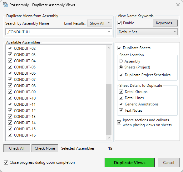 When enabled, EzAssembly now supports duplicating or transferring any project schedule found in an assembly sheet. Upon detecting a project schedule, the add-in will create a corresponding schedule in the project, update the assembly name in the schedule name and filters, and place the newly created schedule in the new sheet. This expanded functionality provides more versatility for users working with specific category or milti-categoy project schedules.
