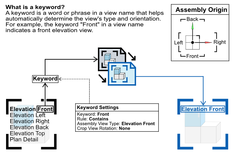 The new Keyword functionality allows users to create assembly views by matching keywords in view names, enabling automatic identification of the appropriate view type and orientation. This feature streamlines the process and improves accuracy in generating assembly views.