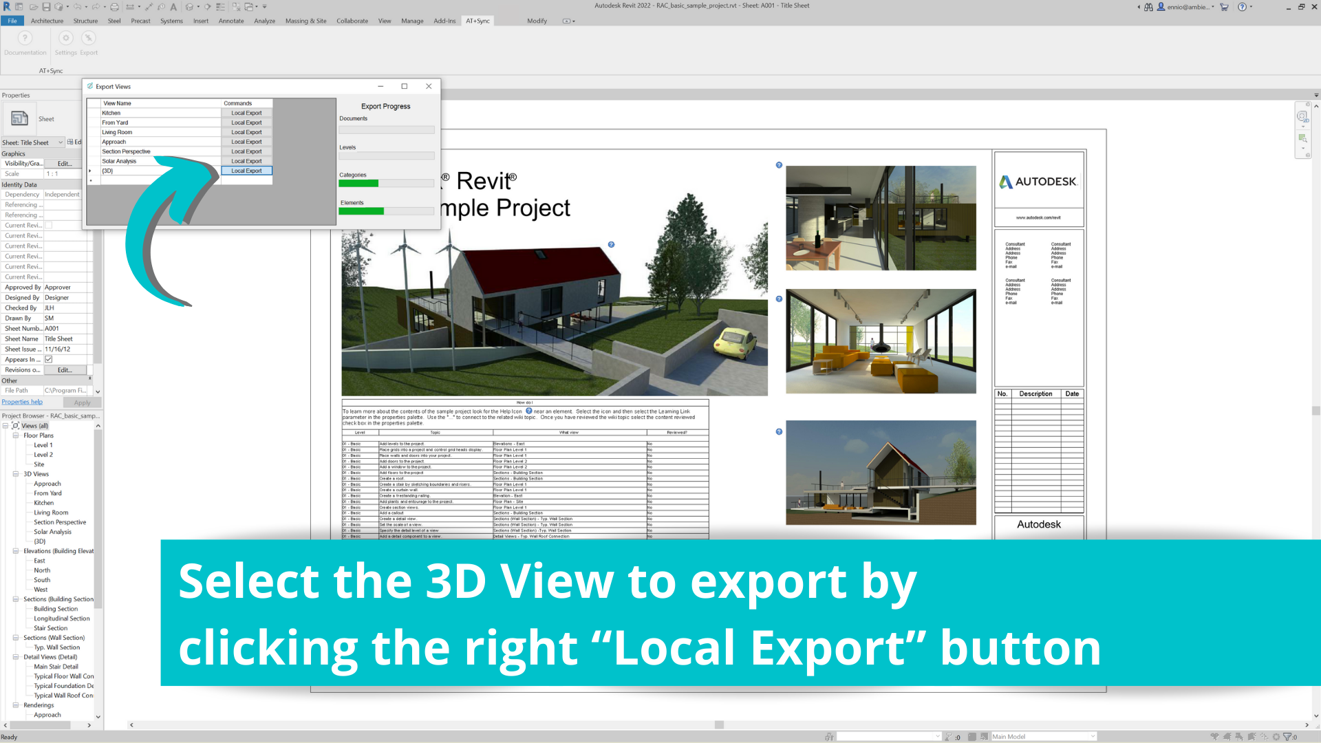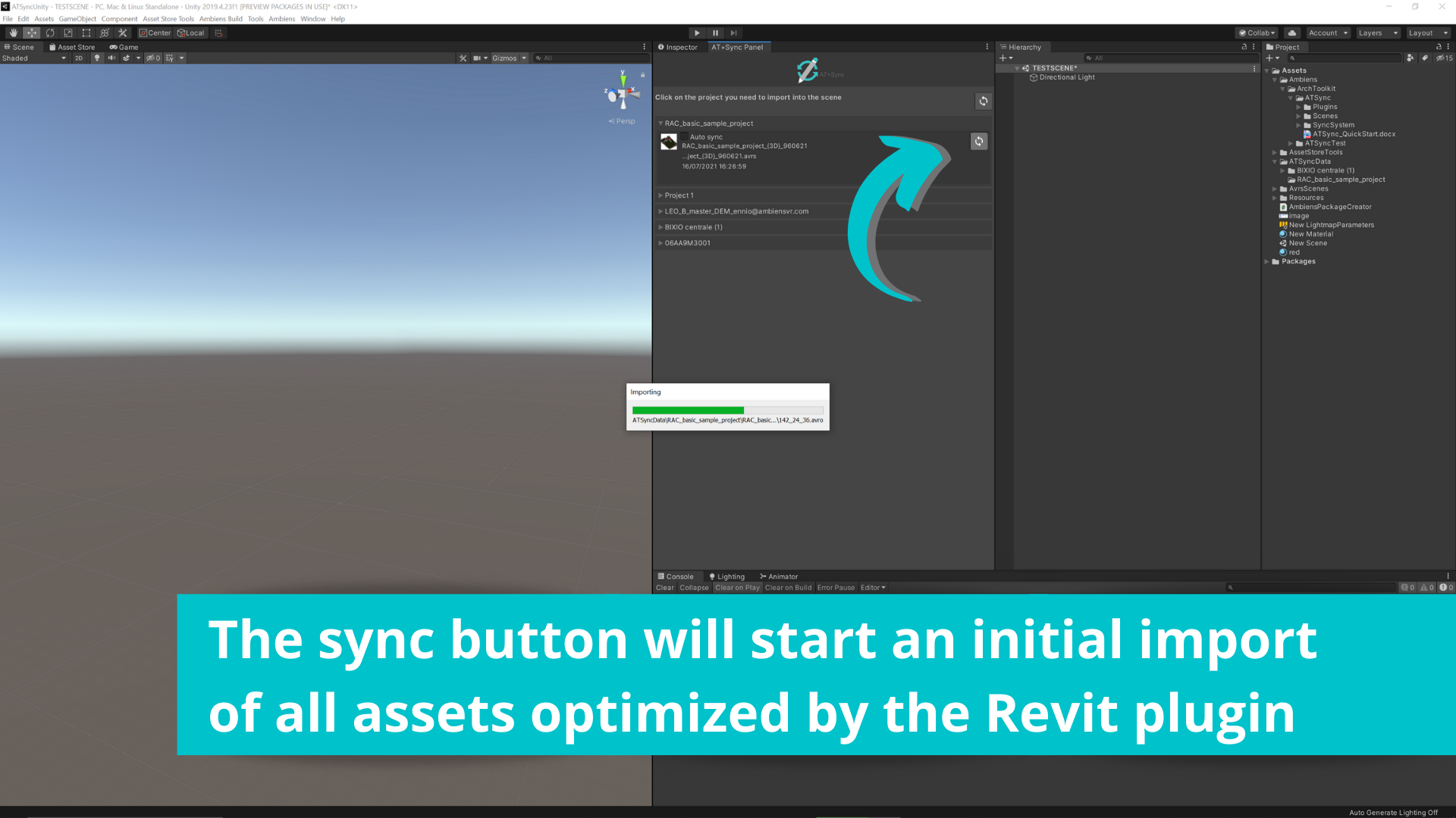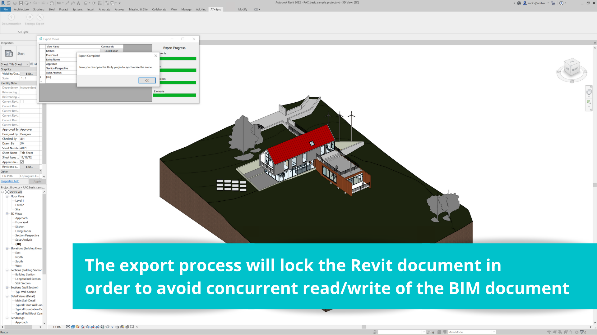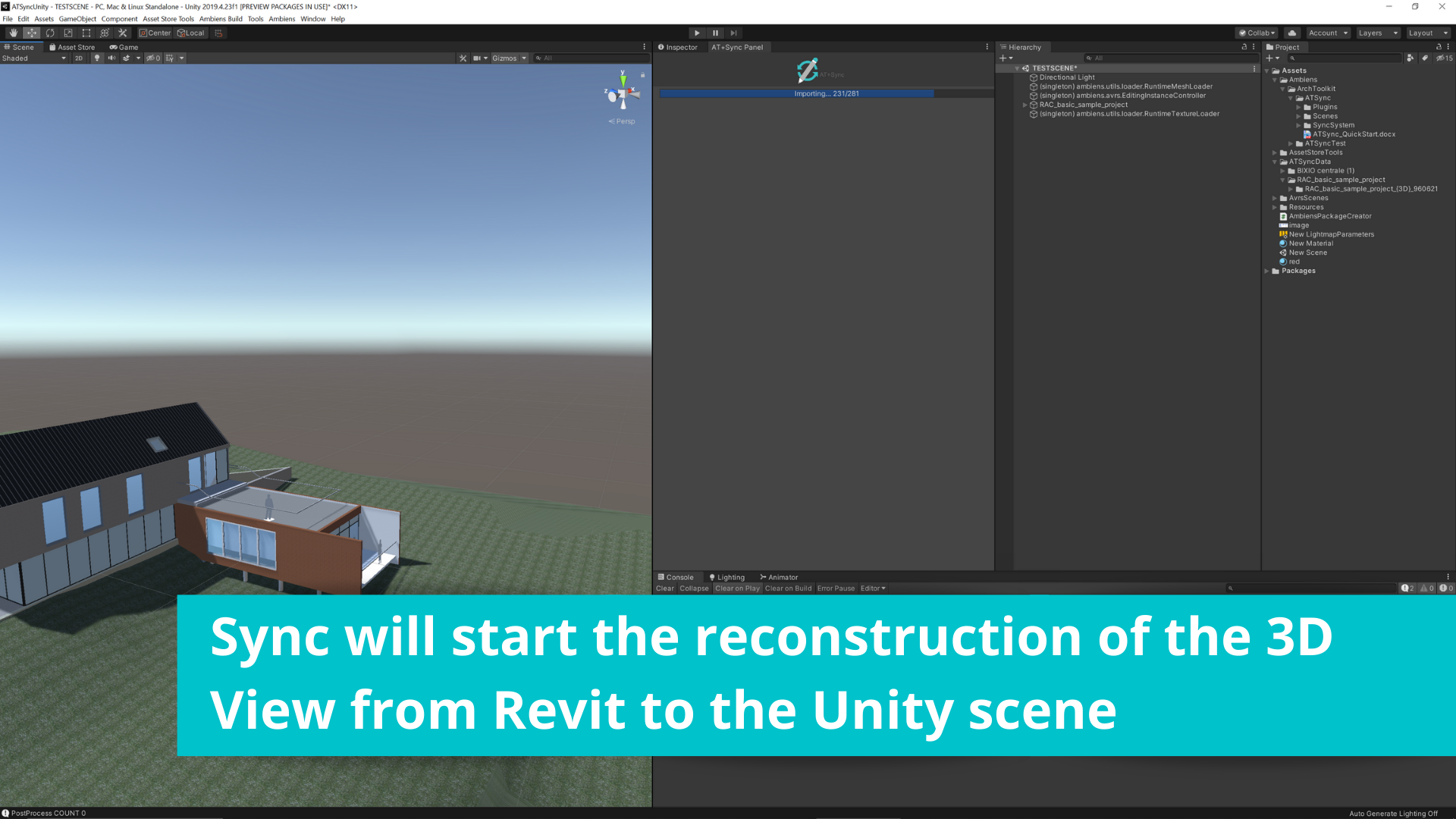 Ambiens Sync lets you export and synchronize Autodesk® Revit® projects into Unity scenes. Connect your usual Revit workflow with Unity and sync any change you make on your file in real time.