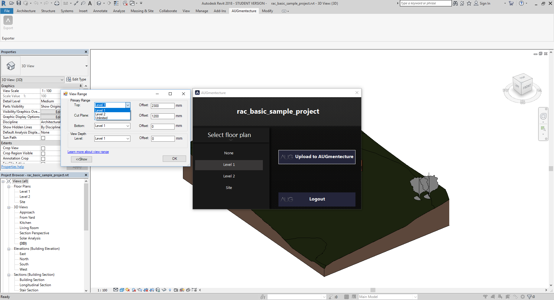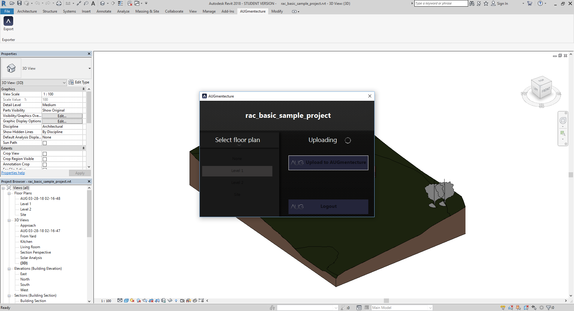 AUGmentecture is a service helping you to view complex 3D models on a mobile device in an Augmented Reality(AR) format. With the help of AUGmentecture plugin, you can seamlessly and securely upload your 3D models and floor plans directly from Autodesk® Revit® to your AUG account to view them later with your mobile device. You just need to select the model in 3D view and optionally select floor plan and you will be able to see the model on your mobile device mapped on your floor plan.