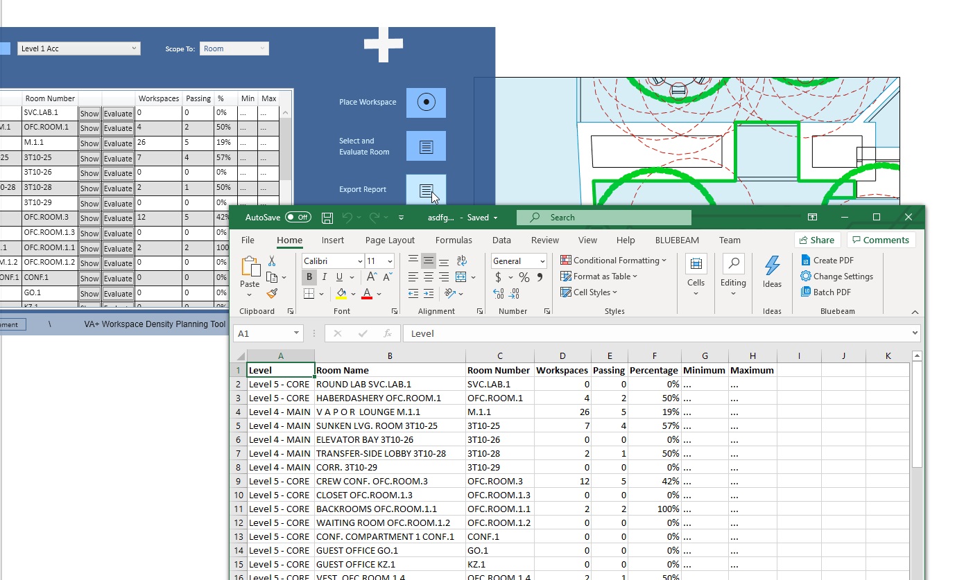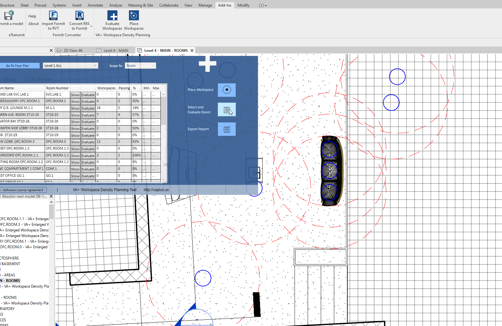 The VA+ COVID-19 Social Distance Planning app analyzes indoor layouts to evaluate social distancing compliance while evaluating re-opening plans during the Covid-19 pandemic. Using a combination of various factors such as distance to doors and clustering, this tool evaluates which layouts are best and which need adjustment.