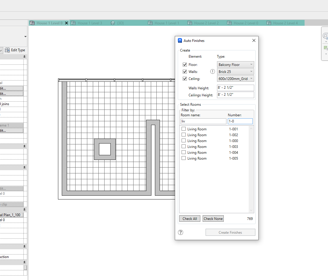 The main features are the creation of separate floors (floor tiles), walls, and ceilings automatically for selected rooms in a project. You can add the finish to all rooms in one go if you wish. Curtain walls and room separators are ignored but the column and wall edges are "coated" with the selected wall type. Additionally, this plugin can be used for the creation of a skirting board around the edges of a room.