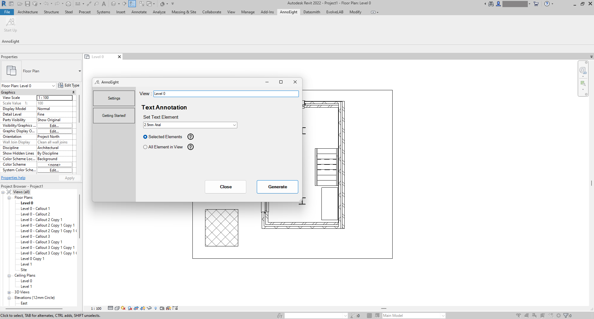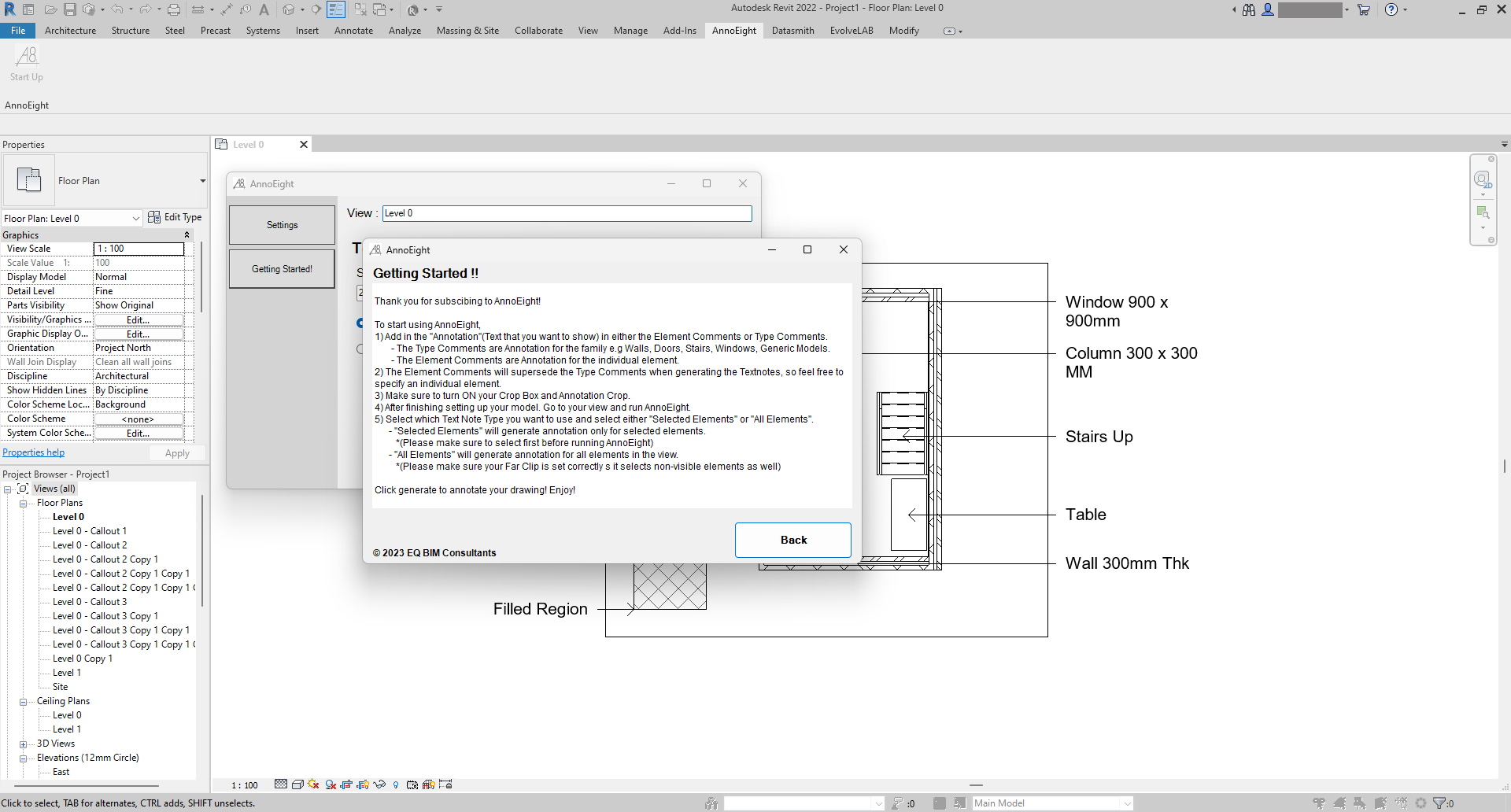 AnnoEight is a Plug-In for Autodes® Revit® that will help generate textnote on your drawings based on the elements in the view. It will generate annotations based on the element type or instance comment that you set and align it to the side of the cropbox on both side depending on the position of the element.