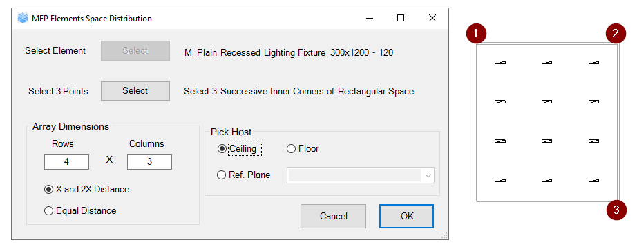This tool is designed to distribute MEP Fixtures automatically on the ceiling such as Lighting fixtures, Air Terminal, Sprinklers, Fire Alarm, and Data Devices, by selecting 3 successive inner corners of rectangular shape space. This add-in will save a tremendous amount of time in the project.