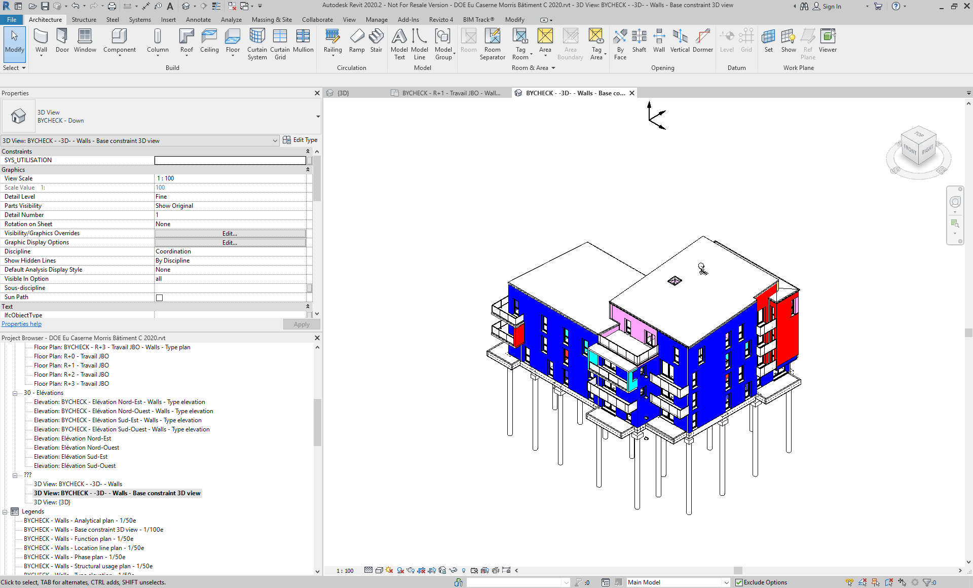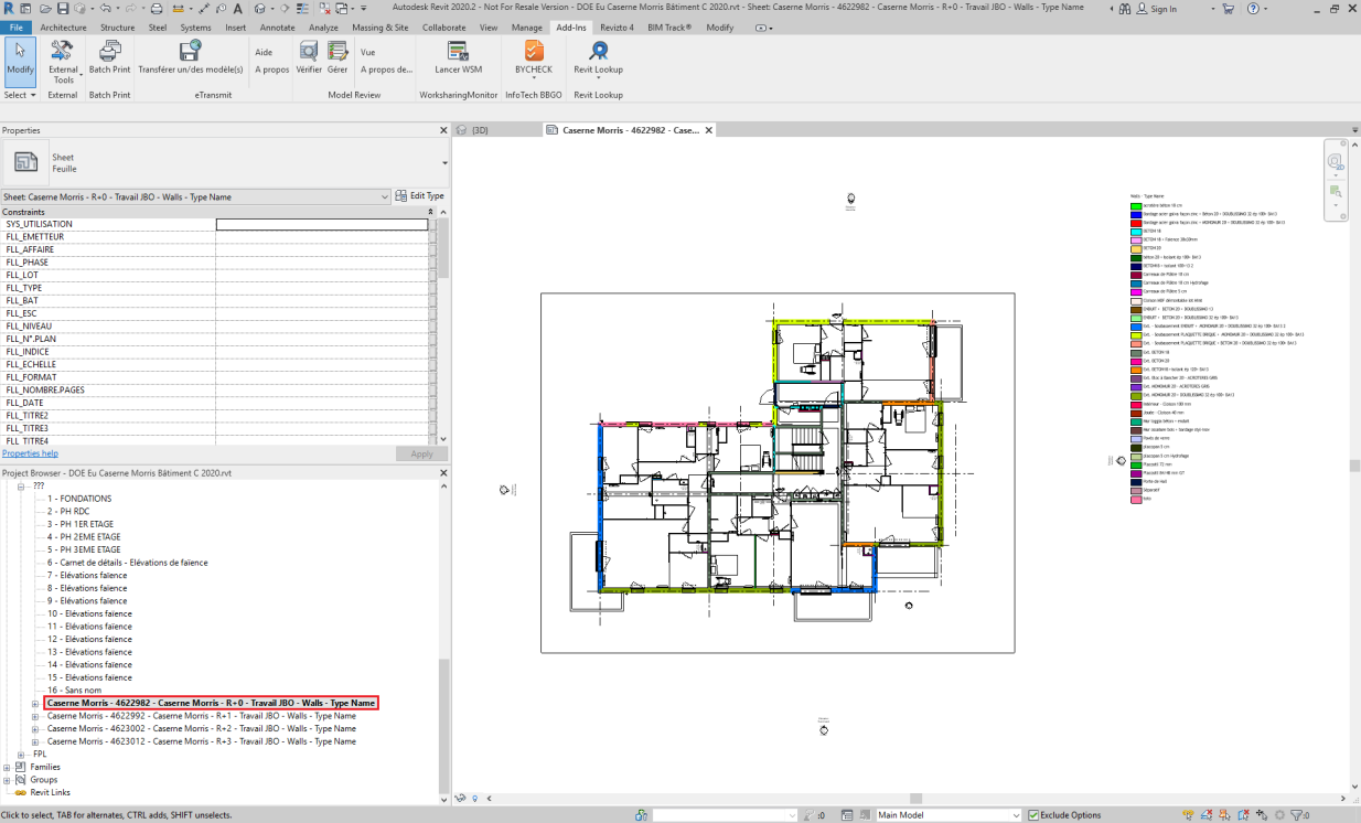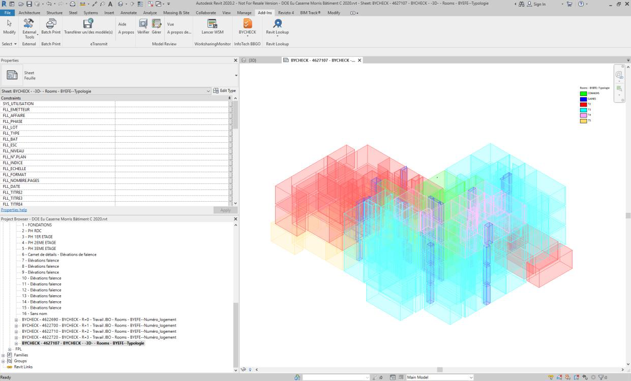 In particular, it produces color analysis views that help the user check what resides in the model (the "I" of BIM), and therefore detect incoherencies easily. Its operation is based on the automatic creation of filters: one color represents one possible value of a parameter.