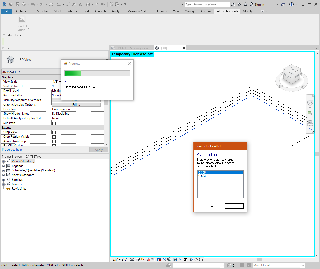 When a conduit route is modified, custom parameter values are not maintained through the entire conduit system. Conduit Audit will take the parameter values that exist in part of the conduit network, and push them throughout the entire network, to keep the parameter information and schedules up-to-date.
