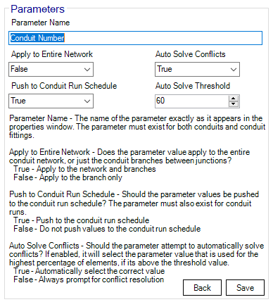 The list of parameters, and whether they apply to just a branch or the whole network is customizable. There is also an auto-number feature to automatically add a conduit number if the parameter is blank in the entire branch or network.