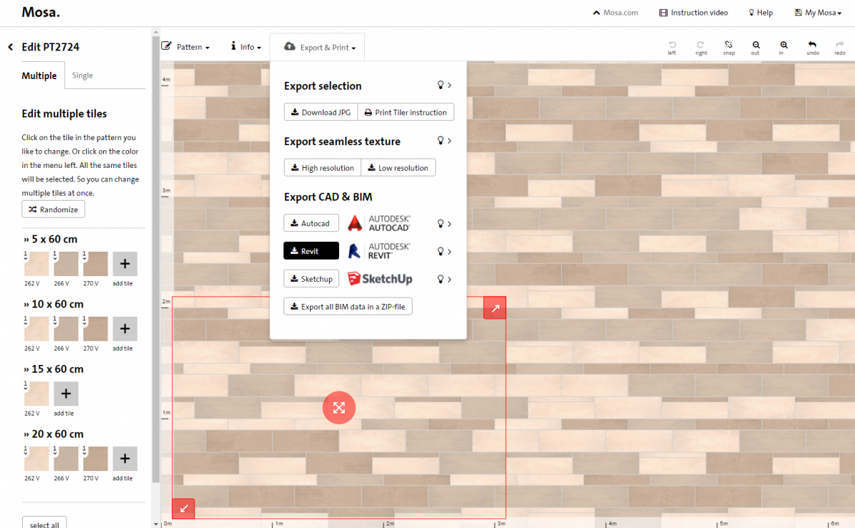 Whether your design is complex or simple, geometric or rhythmic, or demure or bold: whatever the room calls for, you can adjust and compare patterns and even adjust tiles individually. The designs can be easily exported to SketchUp, Autodesk® AutoCAD®, Autodesk® Revit®, and other BIM and CAD software. This makes it even easier to present your ideas in an attractive and appealing way.