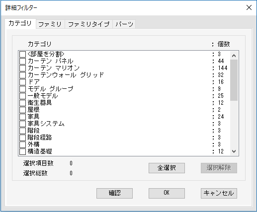 選択している要素をカテゴリ別・ファミリ別・ファミリタイプ別・パーツマテリアル別でフィルタリングします。
