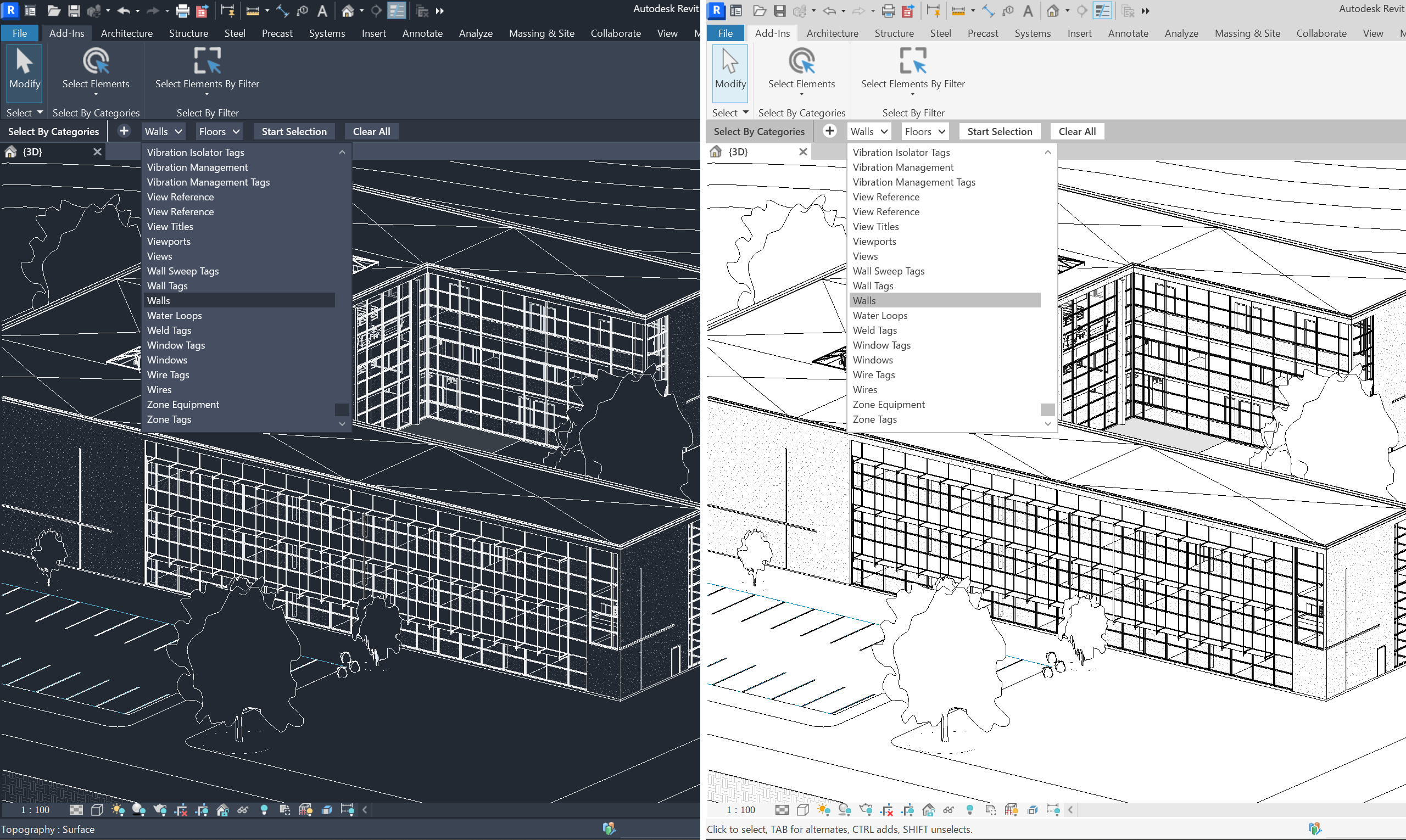 - オプションバーで複数カテゴリまたは単一フィルタを指定して要素を選択できるアドインです。余分なウィンドウが出現しないため作業時の集中力を維持することができます。