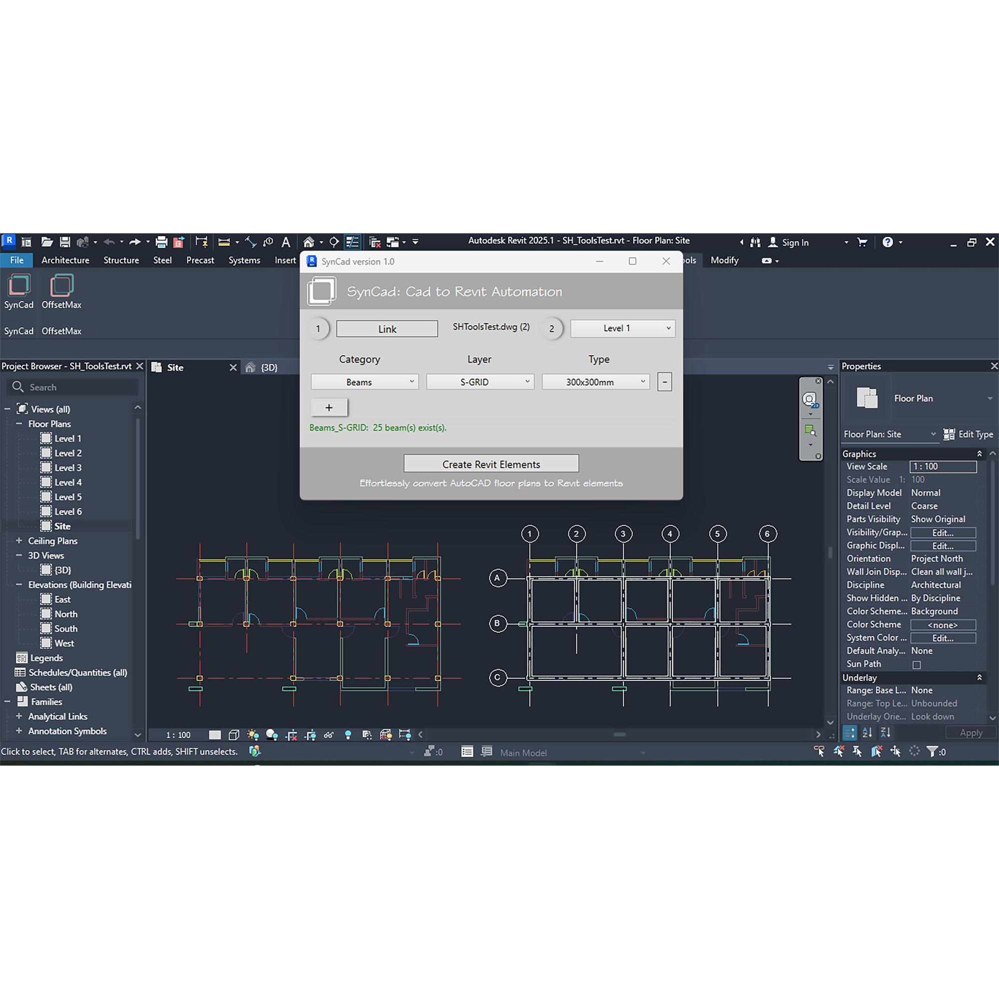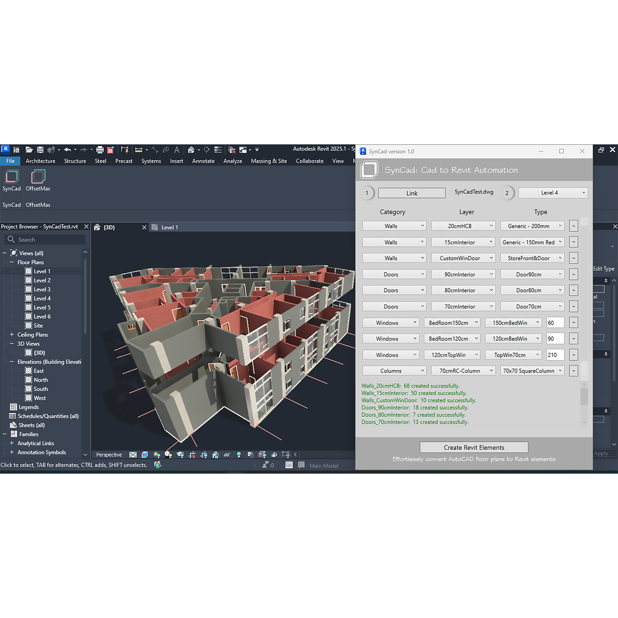 SynCad automates the creation of Revit elements from Autodesk® AutoCAD® floor plans by leveraging the layer names of AutoCAD objects. This tool streamlines the transition from AutoCAD to Revit, allowing architects to convert their drawings into Revit elements quickly and efficiently. By automating this process, SynCad reduces the time spent on manual tracing, enabling architects to focus more on design. Currently, it converts Walls, Doors, Windows, Columns, Grids, and Beams, with plans to support more Revit categories in future releases.