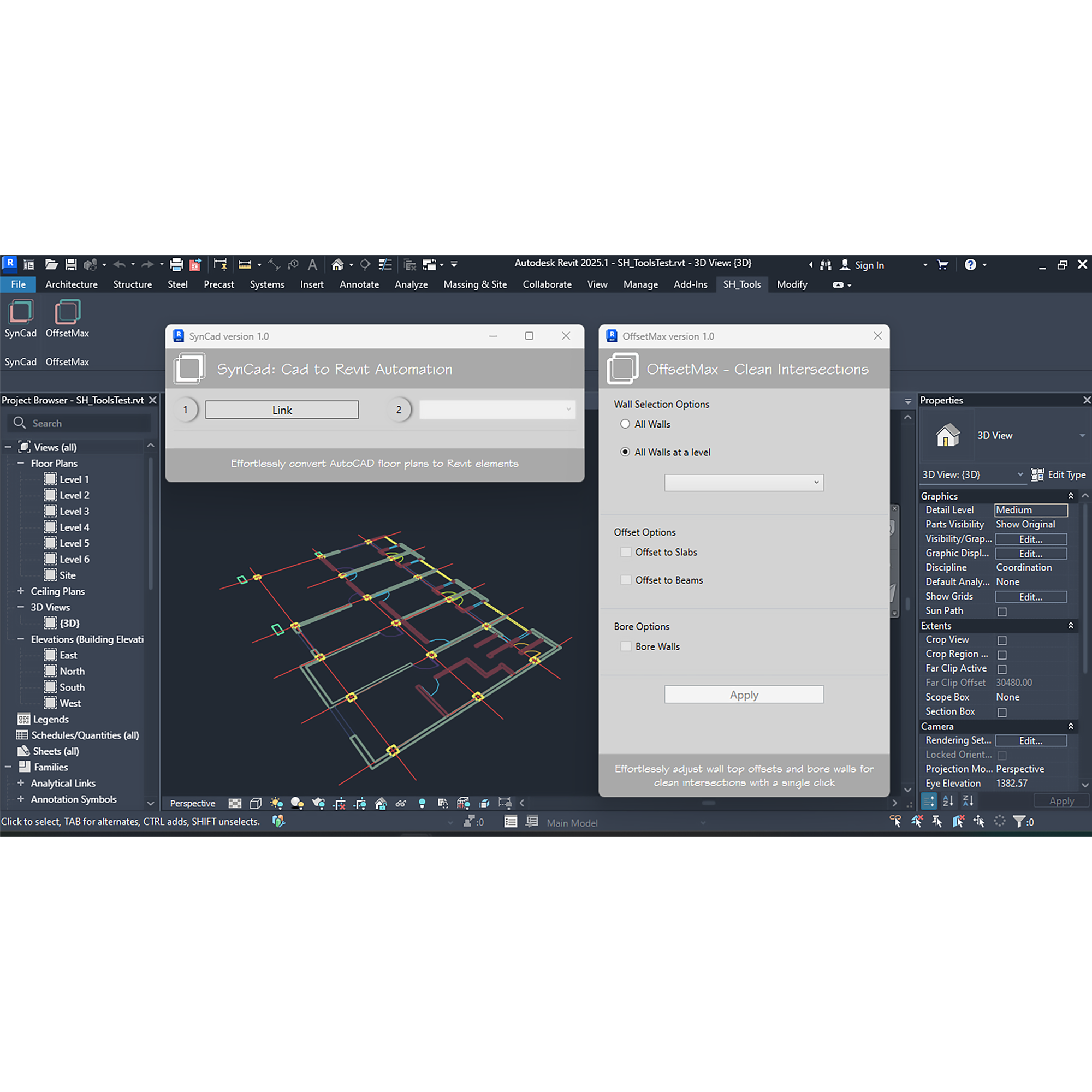SH_Tools is a comprehensive project by Codarch aimed at developing a suite of tools to enhance and streamline the Autodesk® Revit® workflow. This release of SH_Tools contains SynCad and OffsetMax, with plans to expand and introduce more tools in future releases.