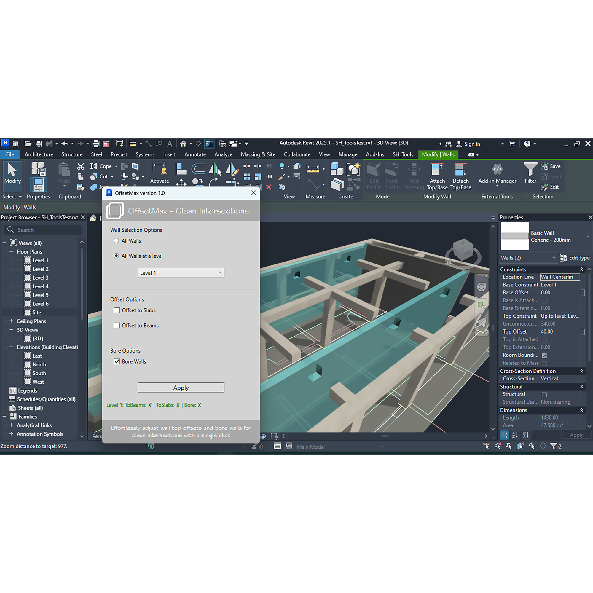 OffsetMax adjusts wall top offsets to slabs and beams one level above its base level. OffsetMax modifies wall top offsets to align with slabs and beams, ensuring accurate volume estimation. If walls intersect with beams perpendicularly, you have the option to bore the walls so the beams can pass without overlapping. All in all, the tool's main objective is to achieve clean intersections - which will result in accurate surface area and volume estimations.