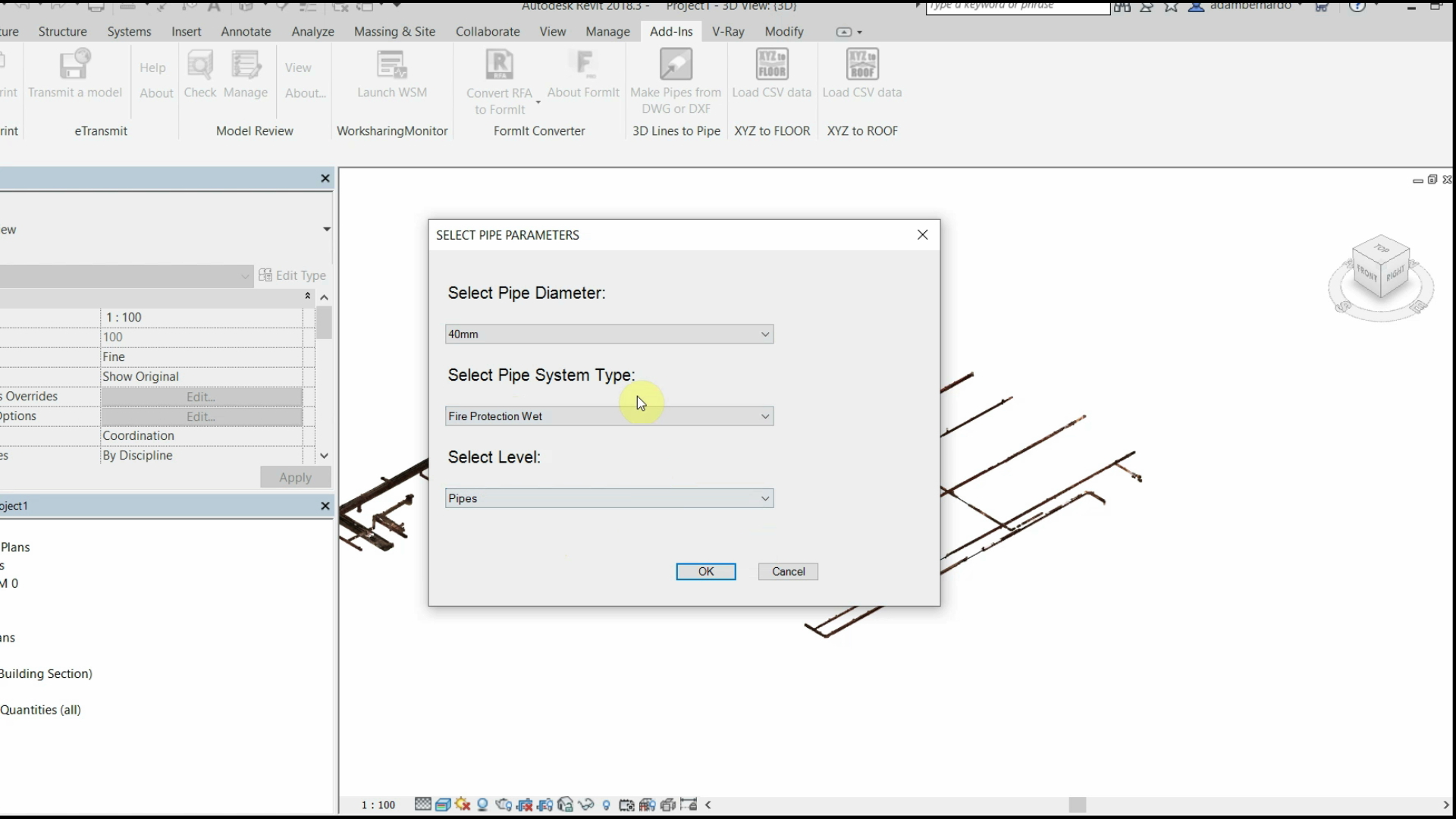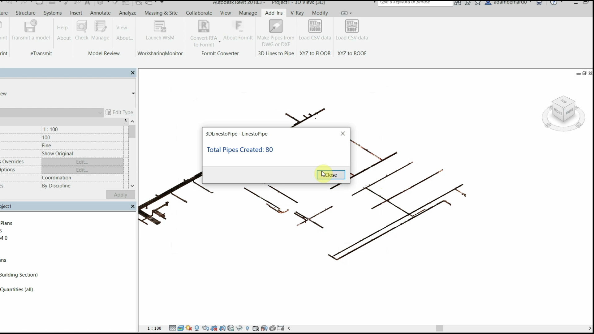 It very accurately matches the centerline of the pipe to the imported lines, and you are able to choose pipe diameter, Pipe System Type, and which level to add the pipes to during the processing phase.