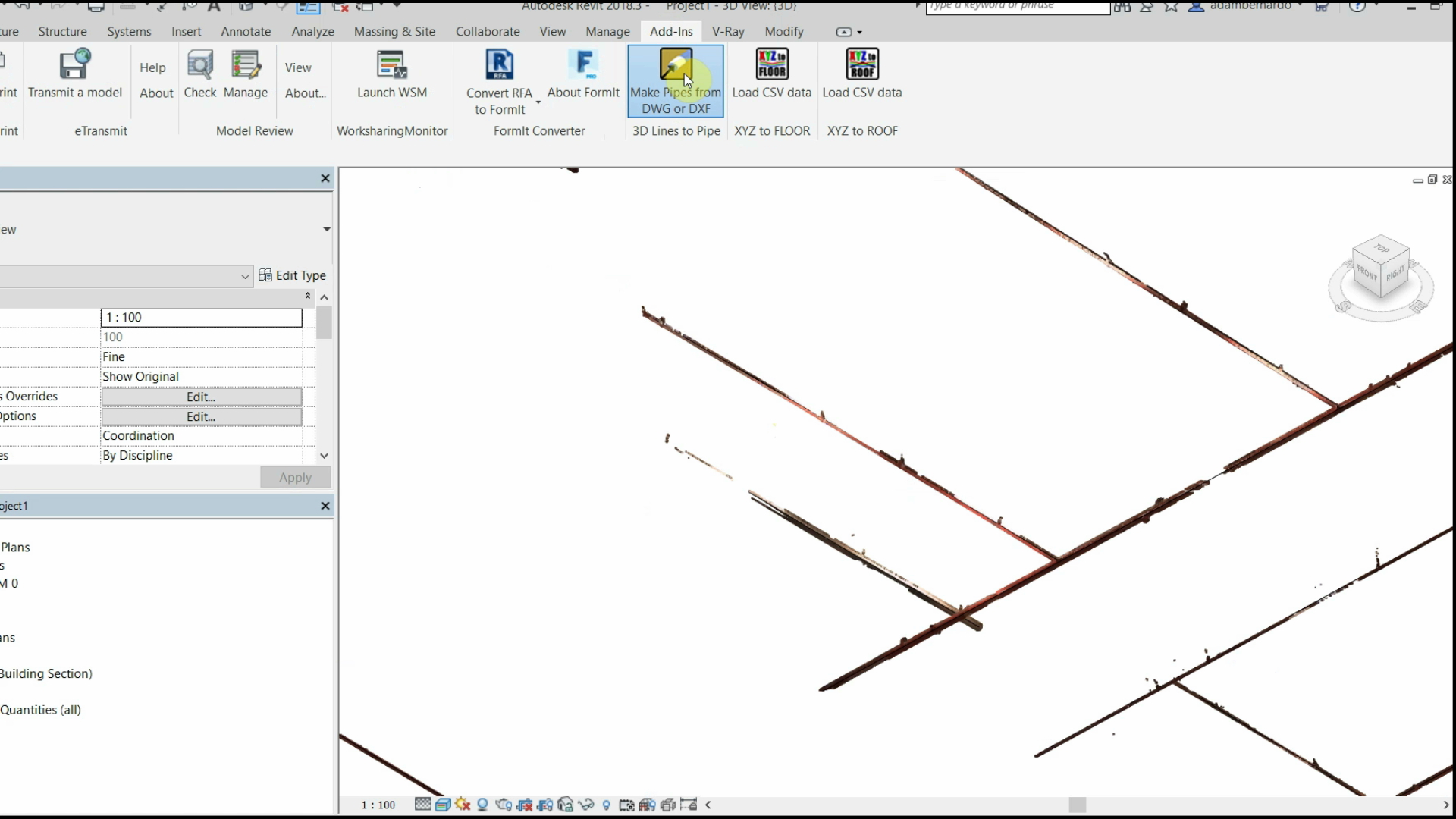 The DWG or DXF files can easily be created from existing point cloud data in Autodesk® AutoCAD® then imported to Autodesk® Revit® for creation of the pipe network.