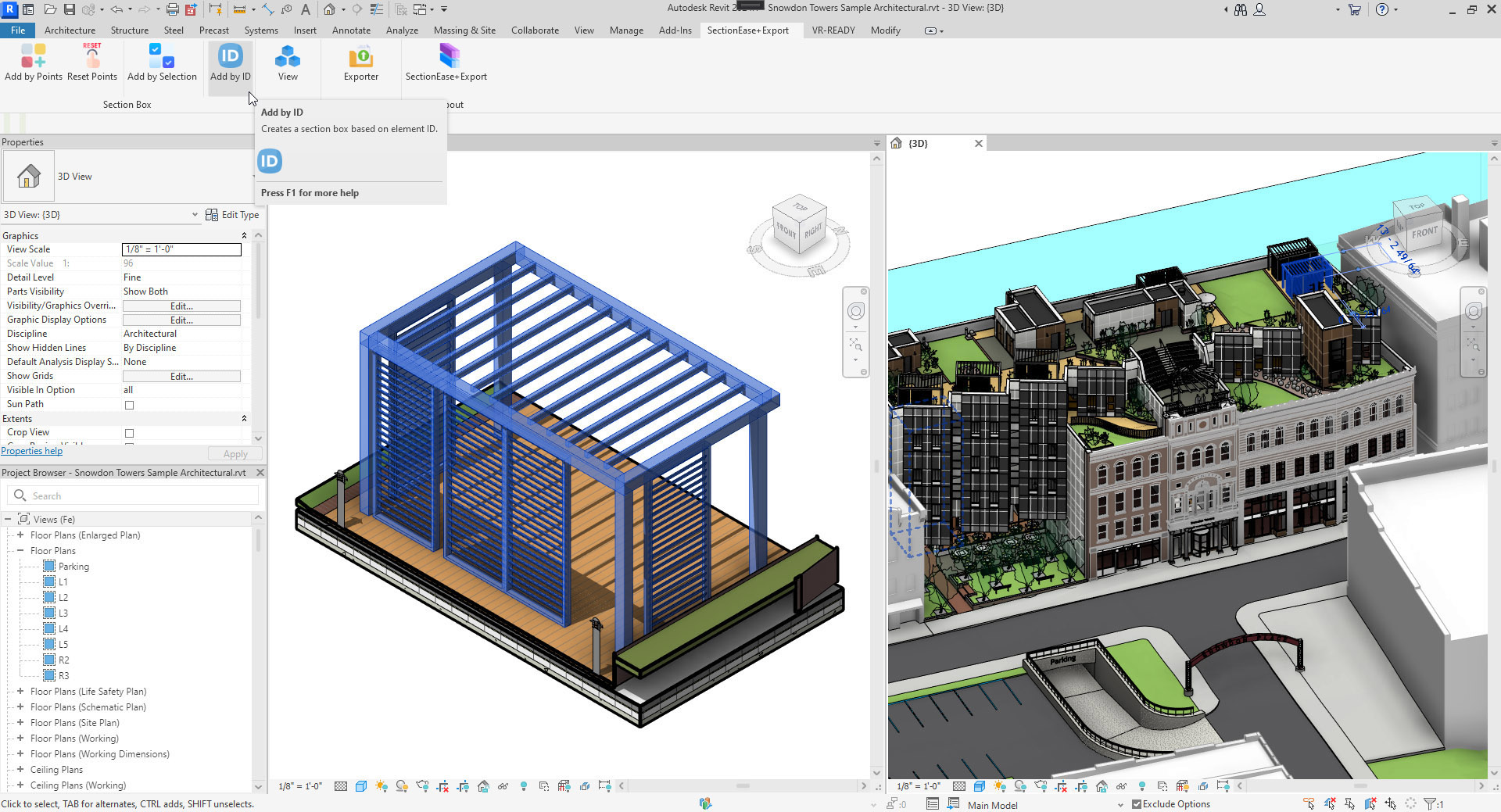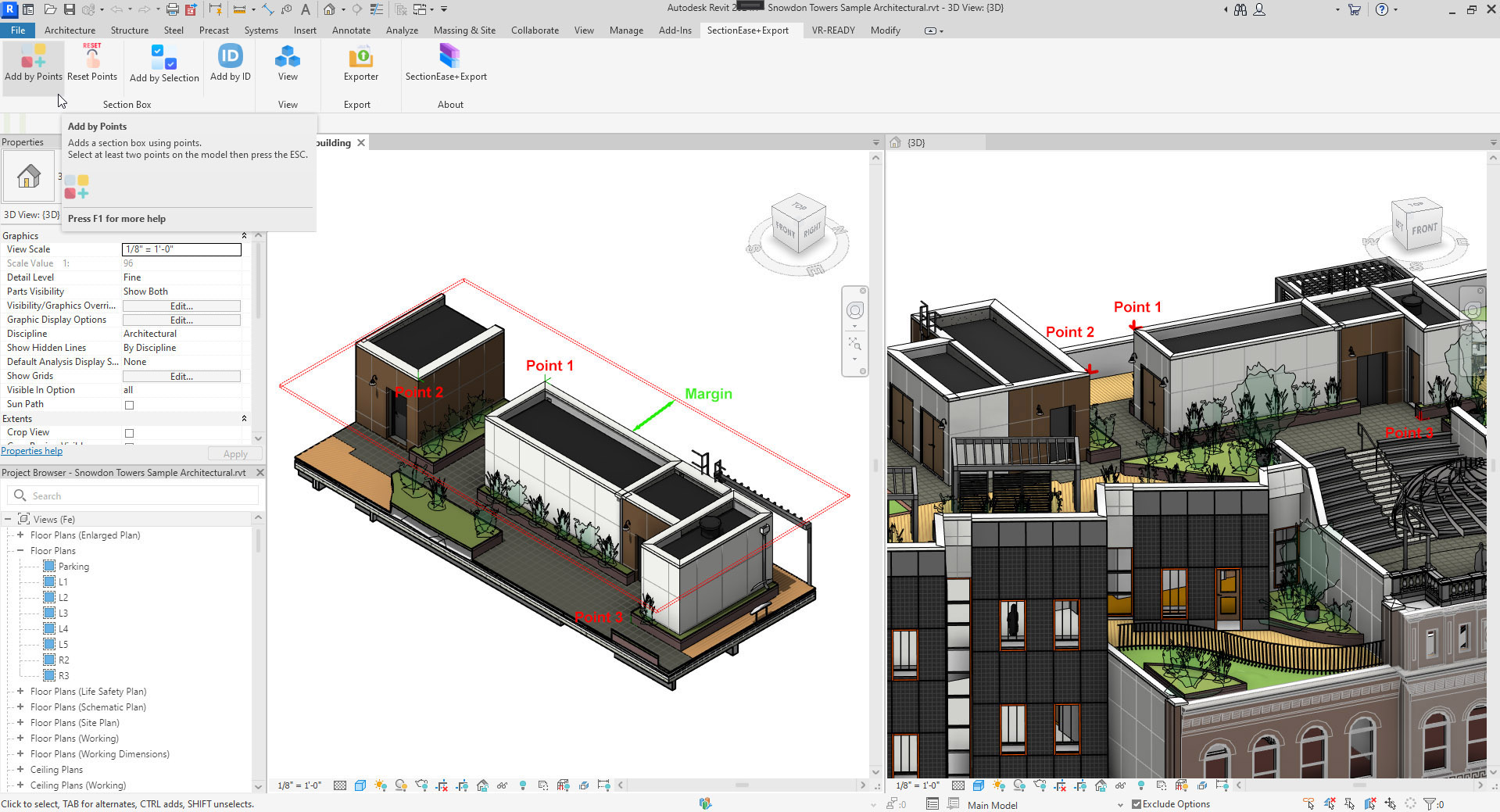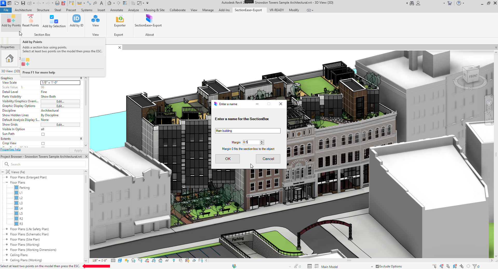 Effortlessly create section boxes with precision using different methods, a point-adding method, selecting the elements by window, and adding section boxes by element ID which are ideal for efficiently handling large-scale models.