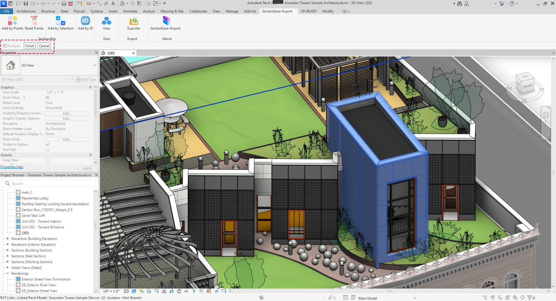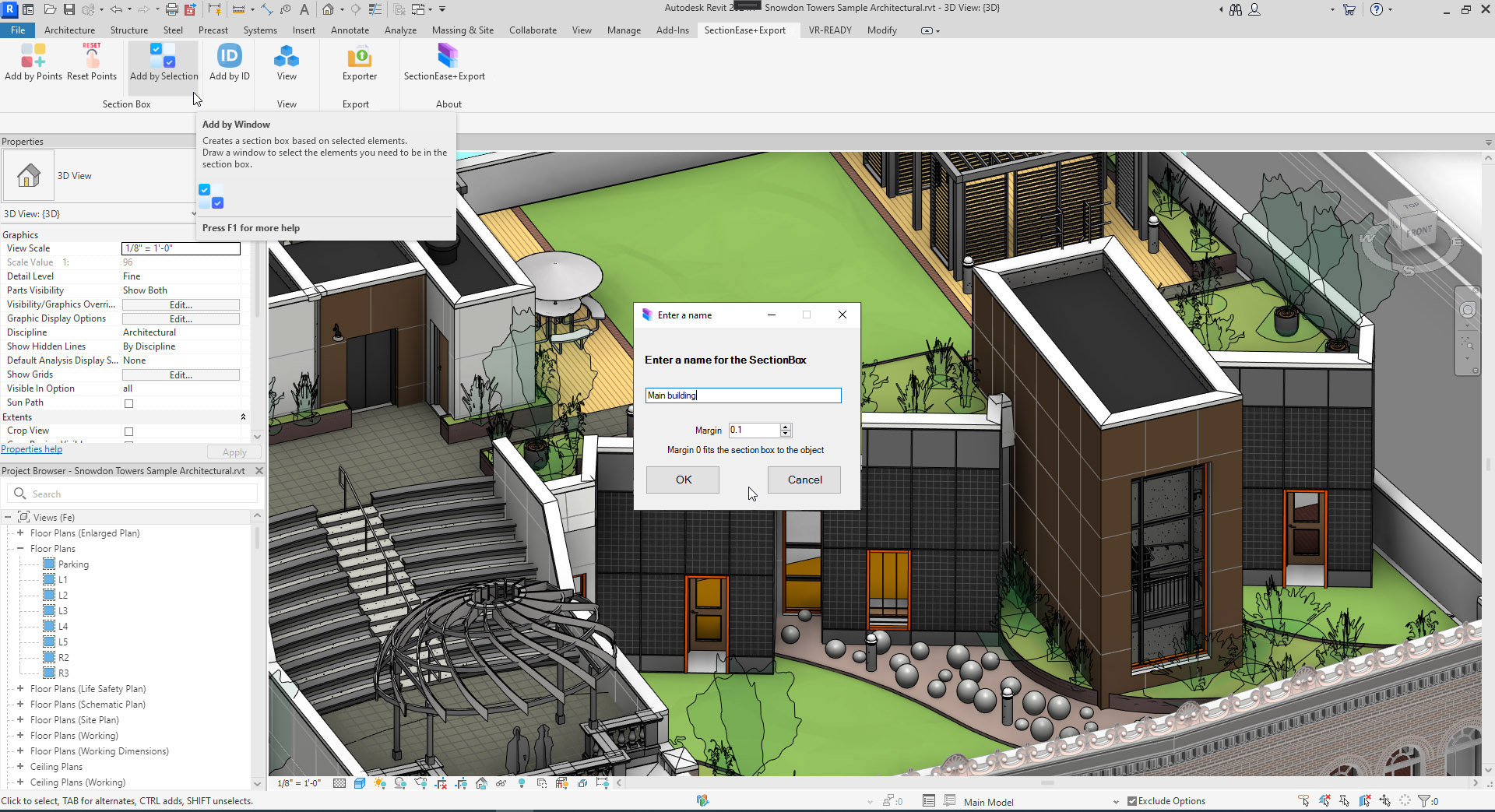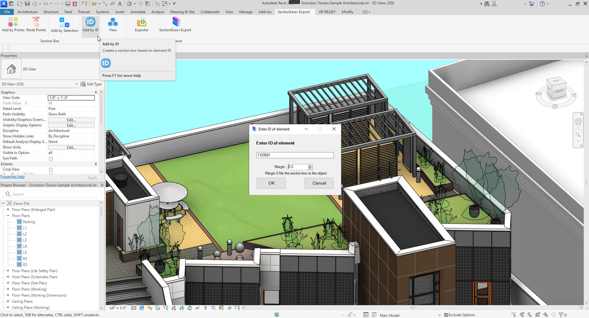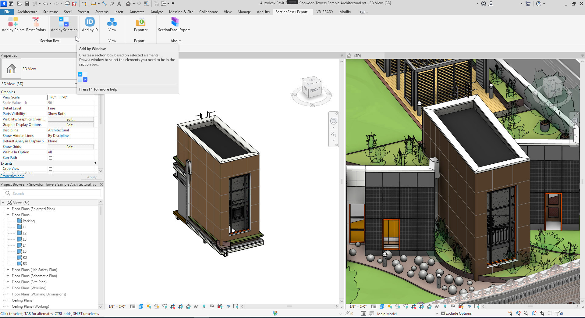 Effortlessly create section boxes with precision using different methods, a point-adding method, selecting the elements by window, and adding section boxes by element ID which are ideal for efficiently handling large-scale models.