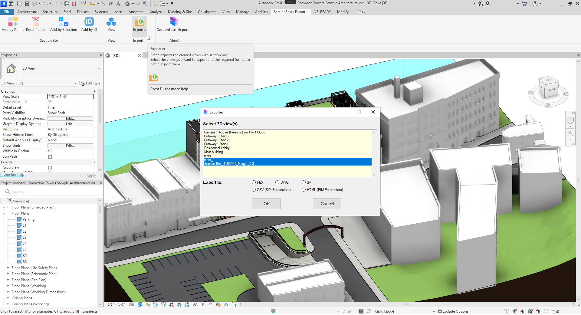 3. Efficient Export: Boost productivity with Batch Export, allowing quick and easy export to FBX, DWG, SAT, CSV, and HTML formats. The CSV and HTML exports include all the parameters associated with the elements visible in the selected view(s).
