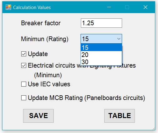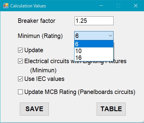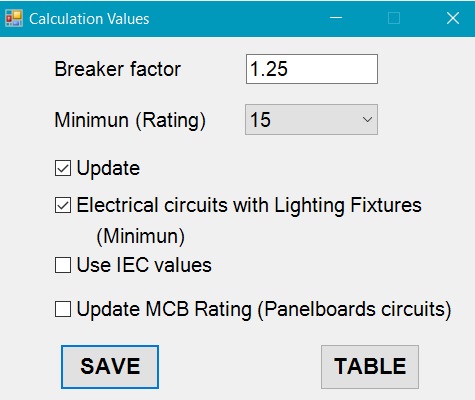 The window has a checkbox named “Update”, it allows to the user update all the circuits to the calculation values. With the checkbox Update in off mode the user could change the breaker factor and minium value of the breaker manually; the other checkbox named “Electrical circuit with lighting fixtures (Rating minimun)” allows to the user set the Rating of electrical circuits with Lighting Fixtures devices connected to a value of minimun.