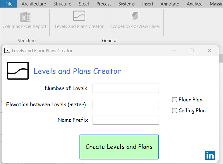 - This feature allows users to create multiple levels in the Revit project with a specified number of levels and offset distance between them. Additionally, users can add a prefix to the names of these levels.